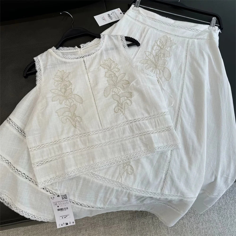 The Isabelle set features a casual high-waist embroidered skirt paired with a sleeveless O-neck crop top, designed for summer wear. This combination offers a comfortable fit with detailed embroidery that adds a touch of elegance. Ideal for warm weather, it provides a stylish yet relaxed look suitable for various casual occasions.