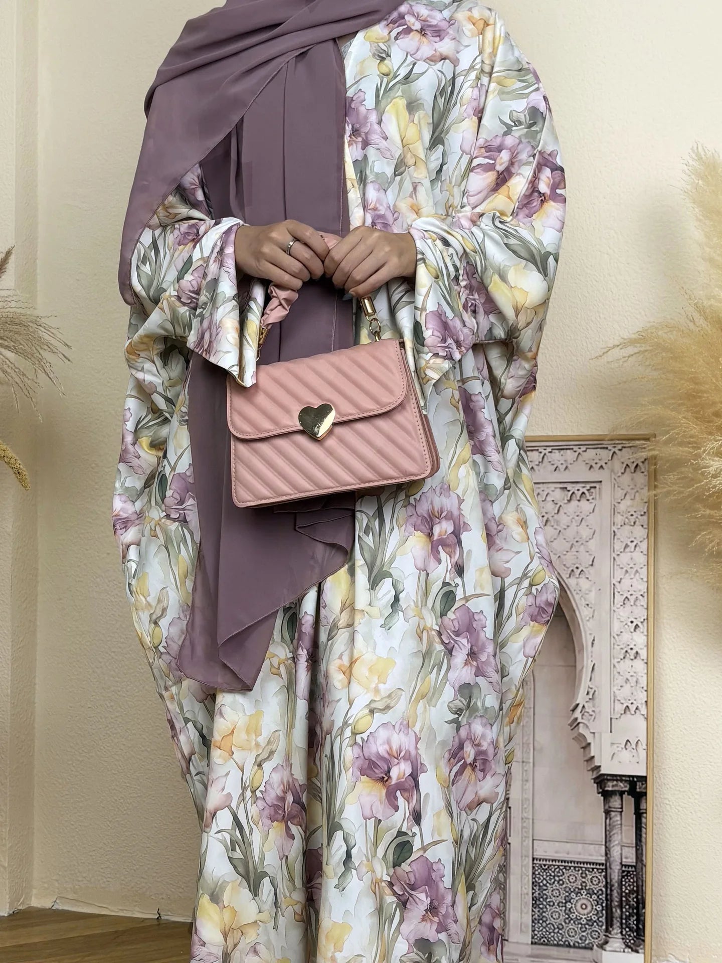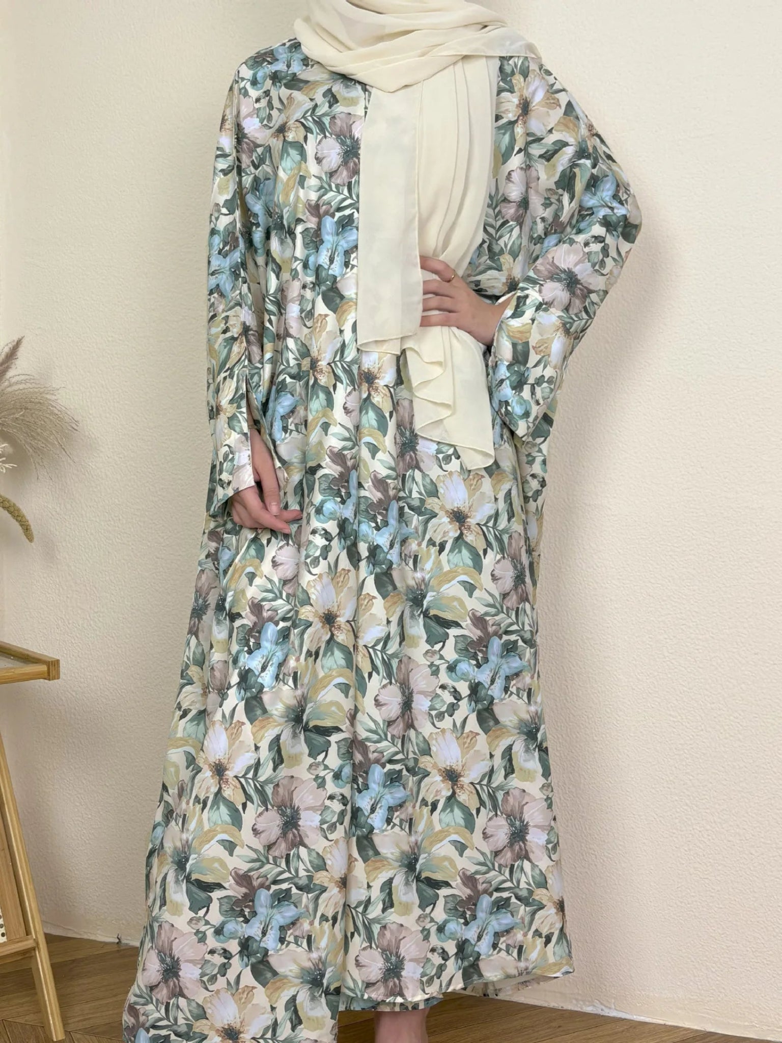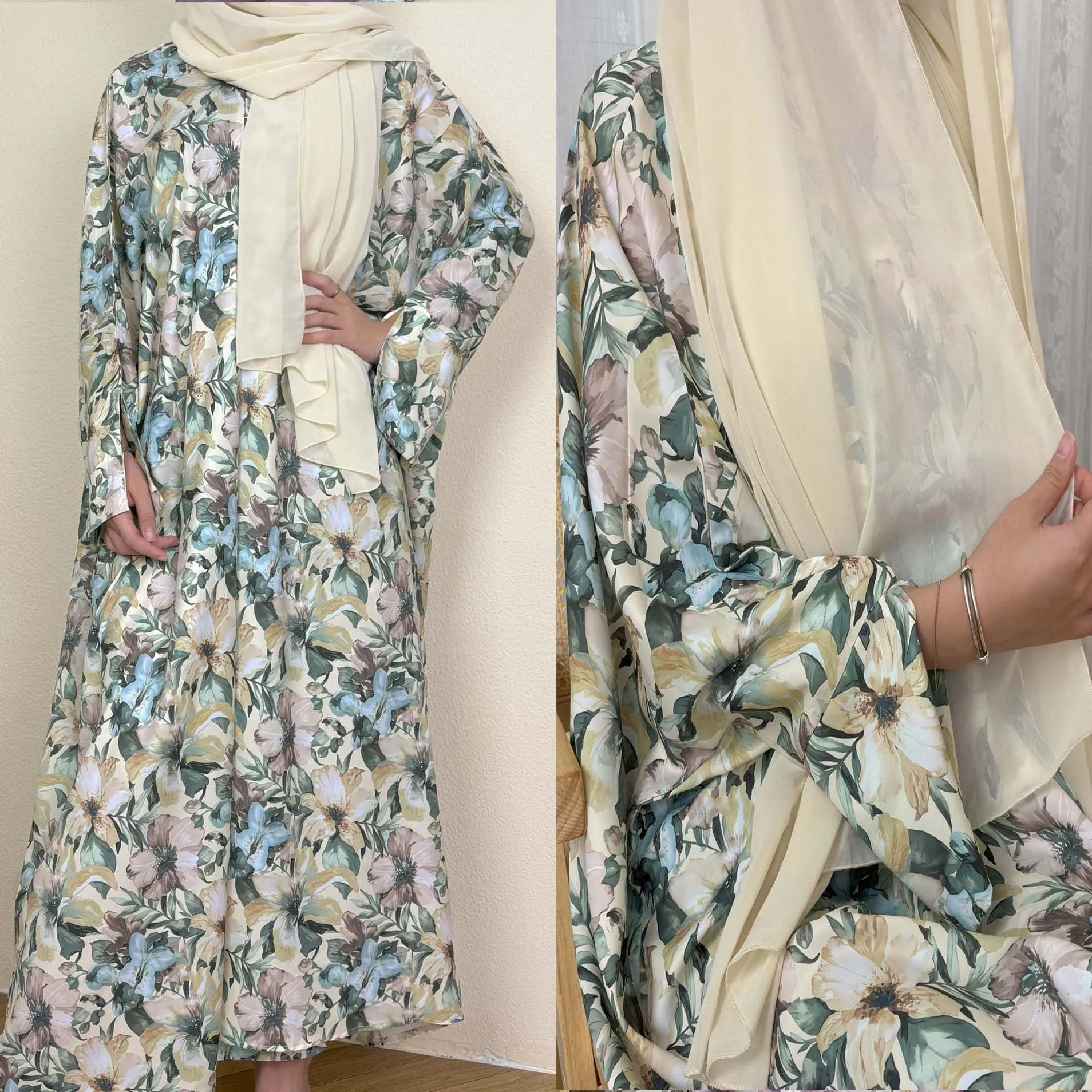 Introducing Abeer, the perfect dress for your summer occasions. This elegant kimono-style abaya features a beautiful floral print and a modest front open design, ideal for daily wear or special events during Ramadan and EID. Complete with a matching scarf, Abeer offers both style and comfort for Muslim women.
