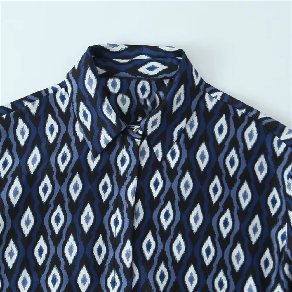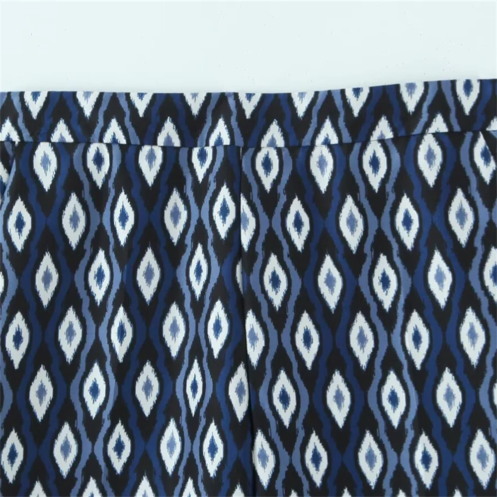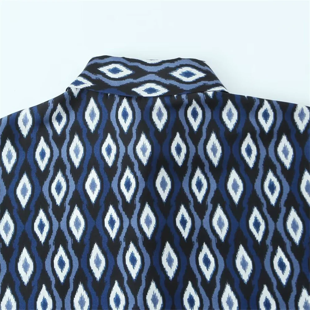 The Alessandra set features a long-sleeved shirt and pants with a striking geometric print, perfect for spring and summer. Crafted to combine comfort and style, this women's outfit offers breathable fabric and a modern silhouette, making it an excellent choice for both casual and semi-formal occasions.