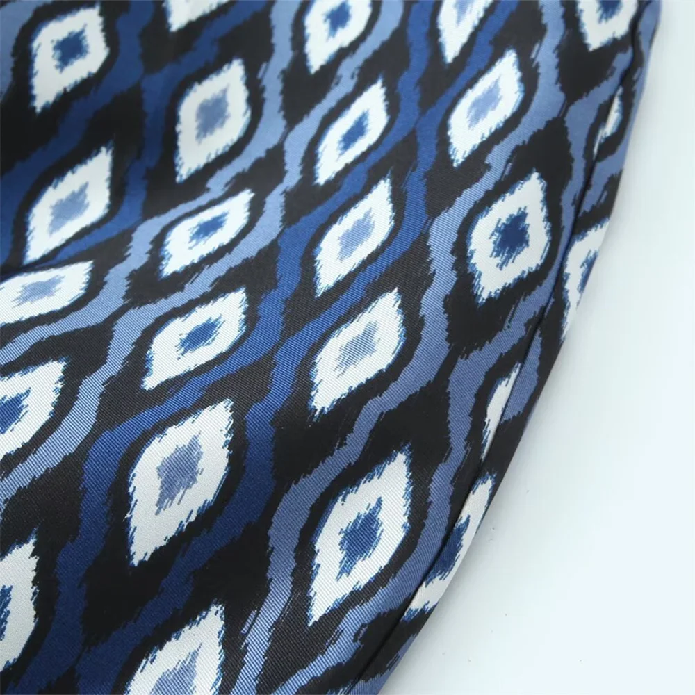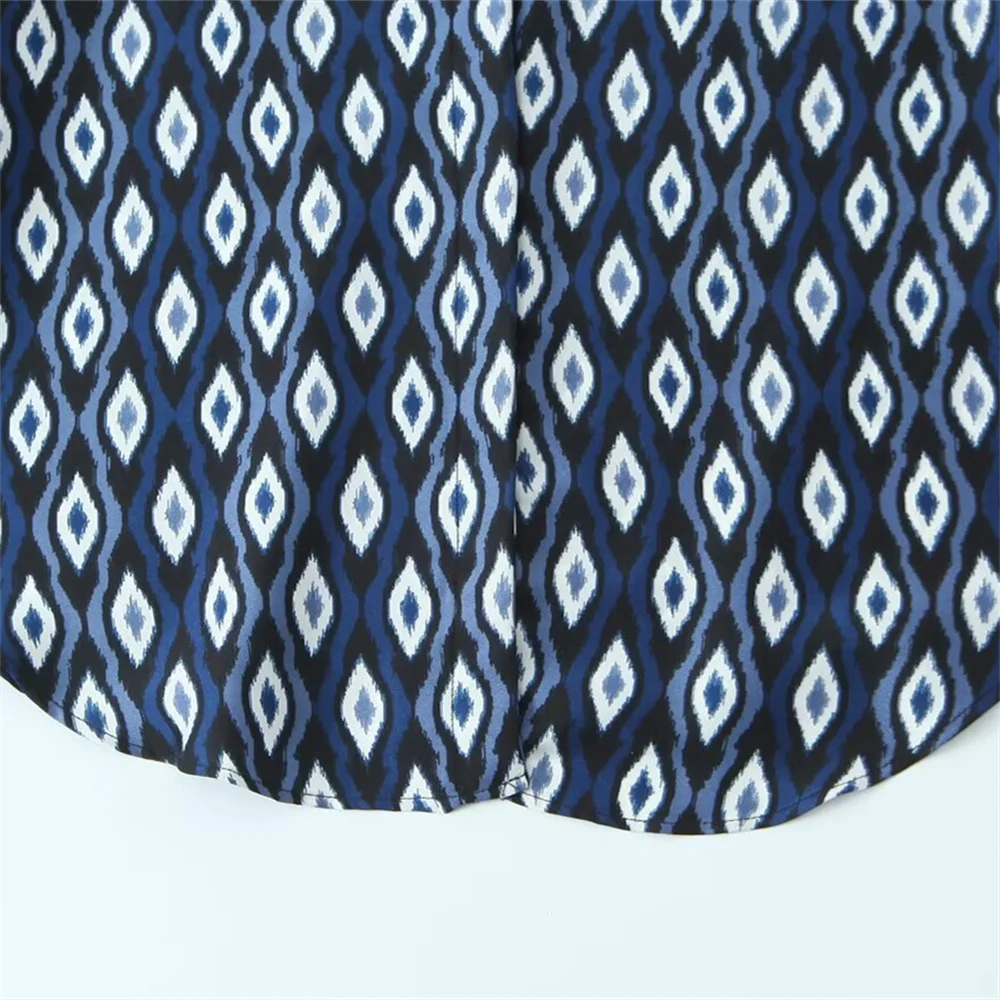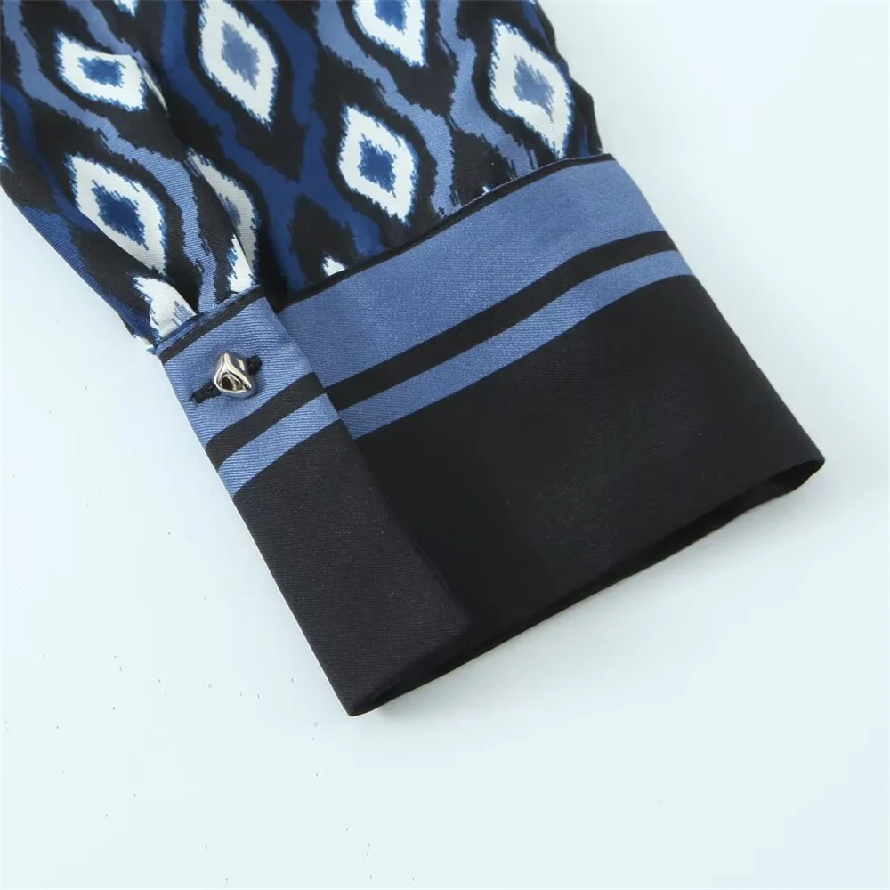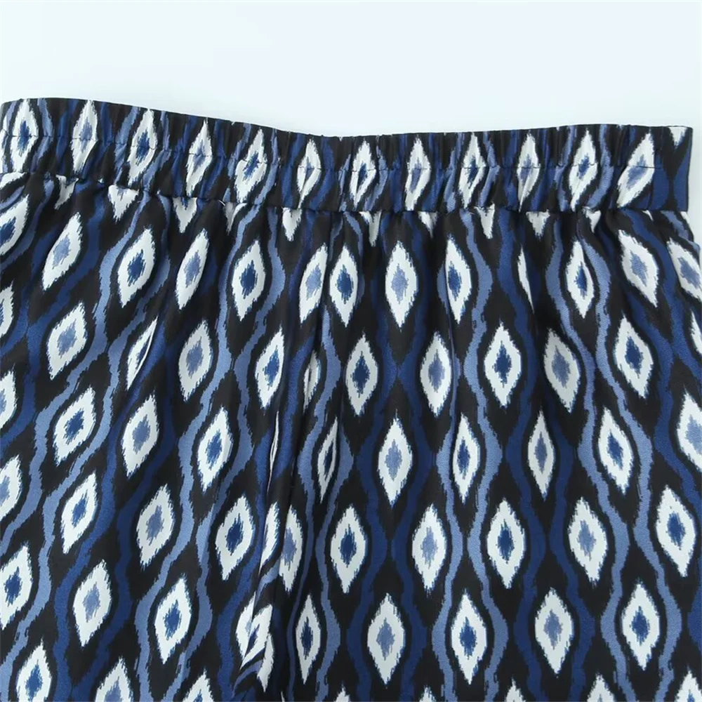 The Alessandra set features a long-sleeved shirt and pants with a striking geometric print, perfect for spring and summer. Crafted to combine comfort and style, this women's outfit offers breathable fabric and a modern silhouette, making it an excellent choice for both casual and semi-formal occasions.