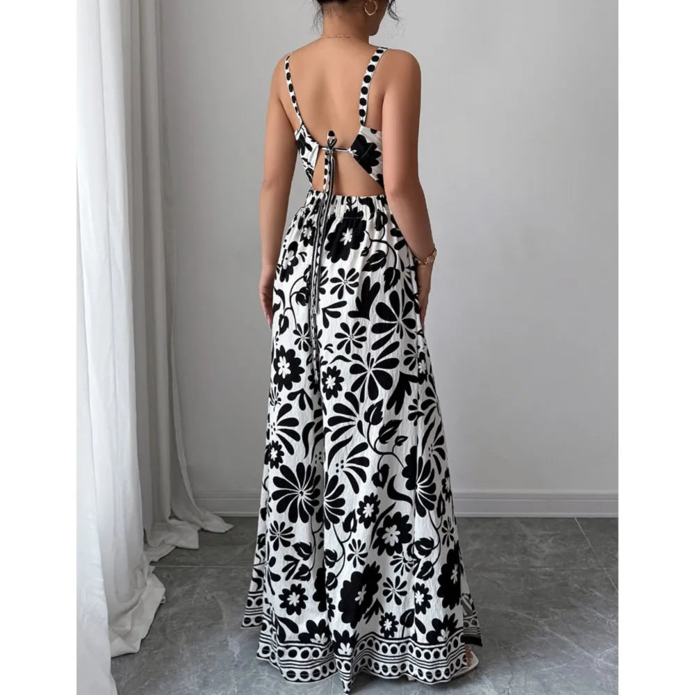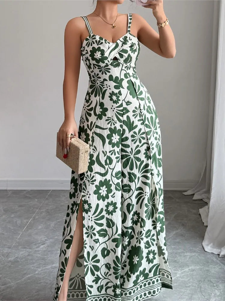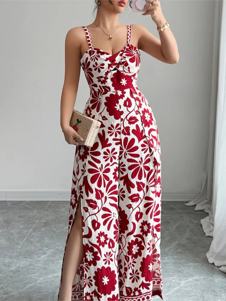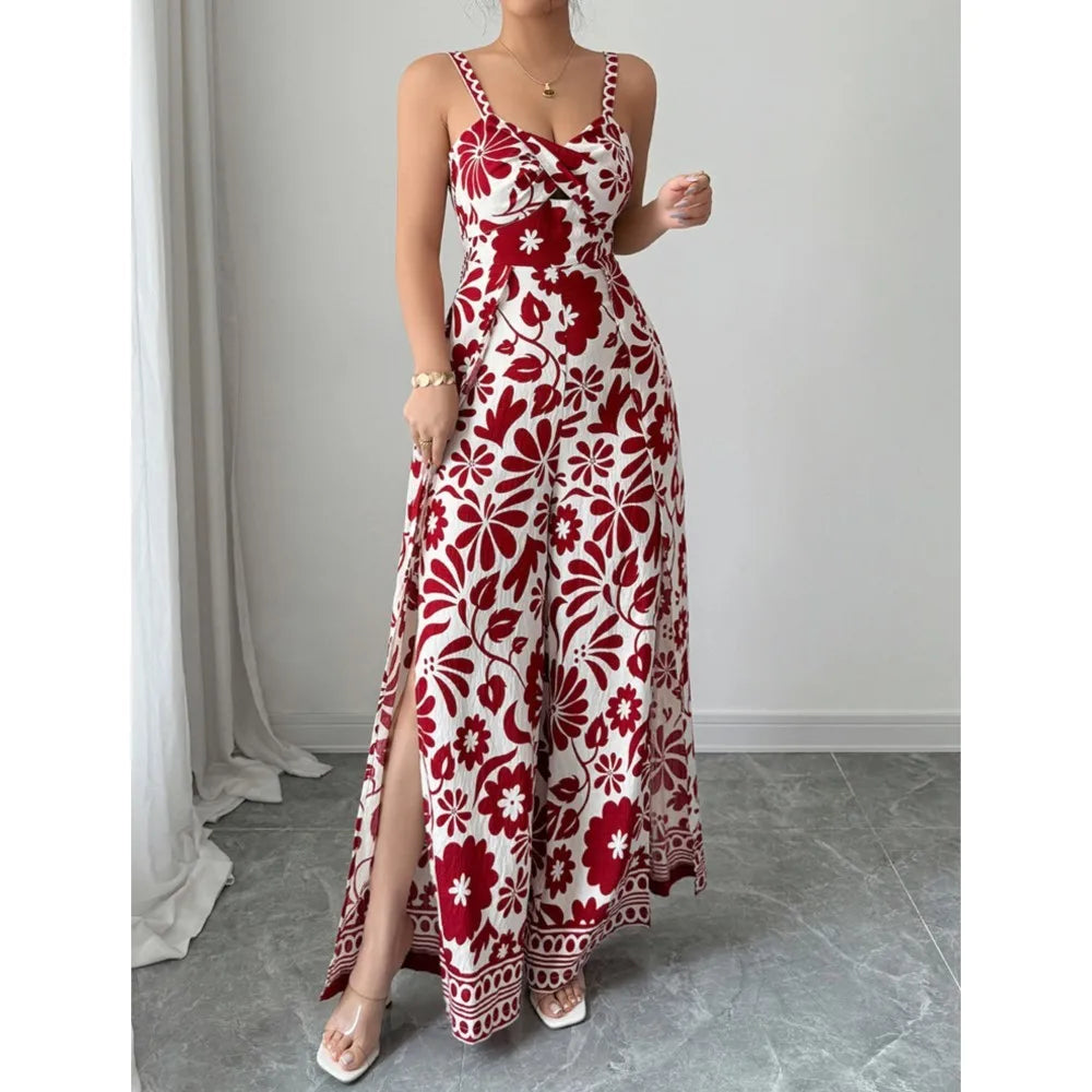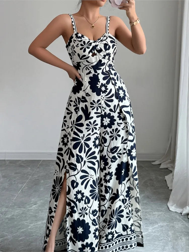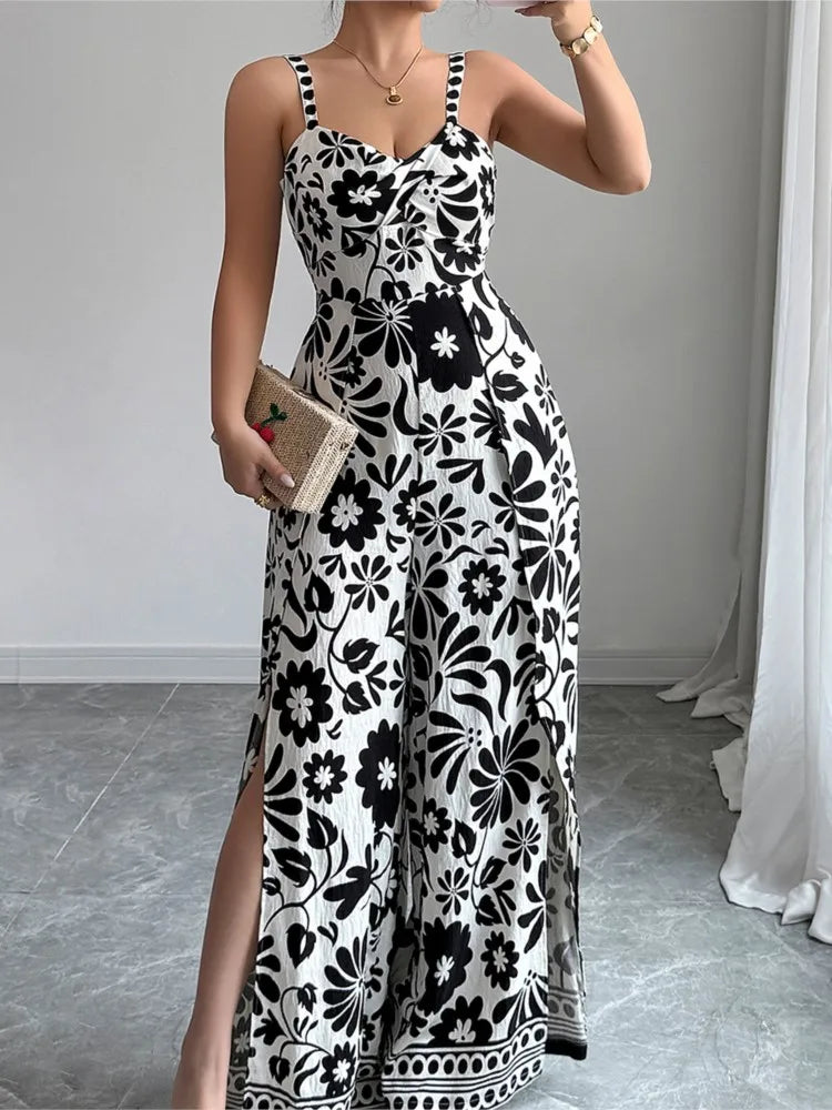 Introducing Andrea, the perfect jumpsuit for a day at the beach or a night out on the town. Its sexy halter design and printed pattern add a touch of elegance, while the wide-leg and irregular split style offer a slimming and fashionable look. Make a statement with this one-of-a-kind jumpsuit.
