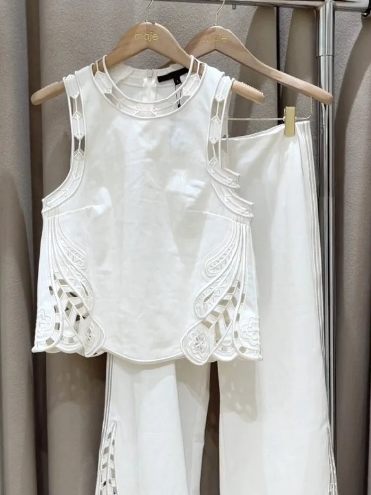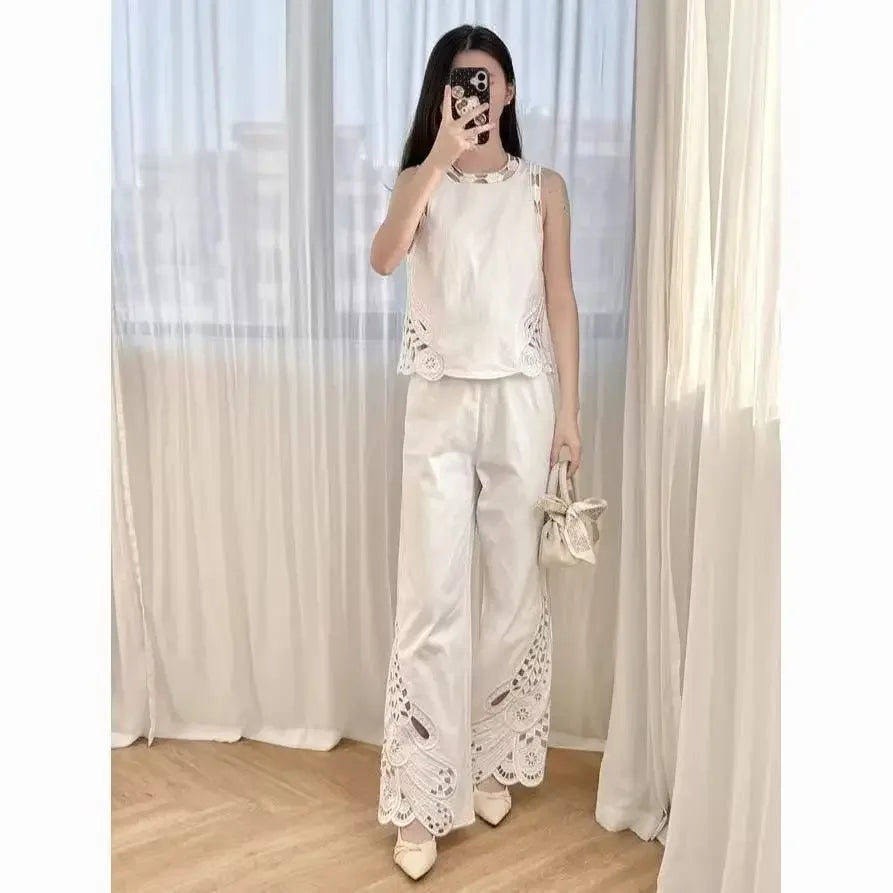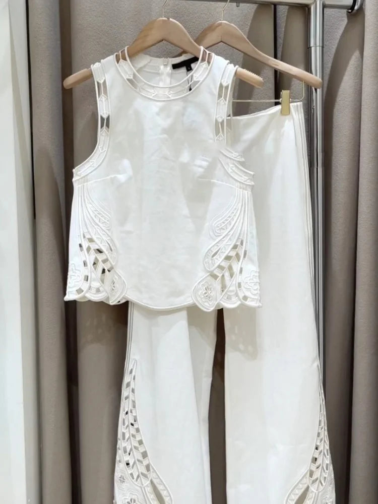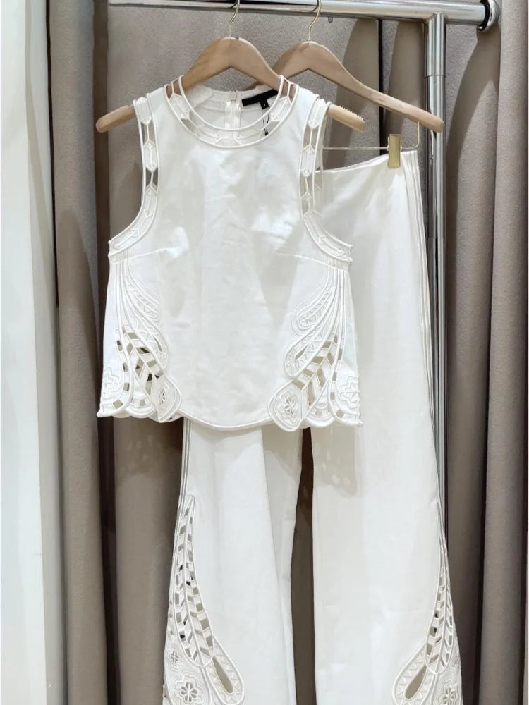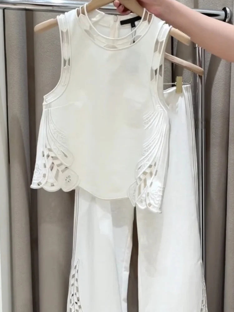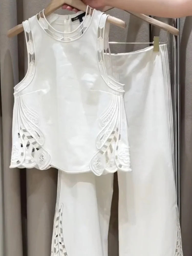 The Andrea two-piece set offers a luxurious summer look with a high-end design featuring a hollow-out sleeveless top with an O-neck and matching straight pants. Crafted in elegant white, this outfit combines contemporary style with comfort, making it ideal for sophisticated daytime or evening occasions. Its tailored fit and breathable fabric ensure a flattering silhouette and ease of wear, perfect for women seeking both fashion and refinement.