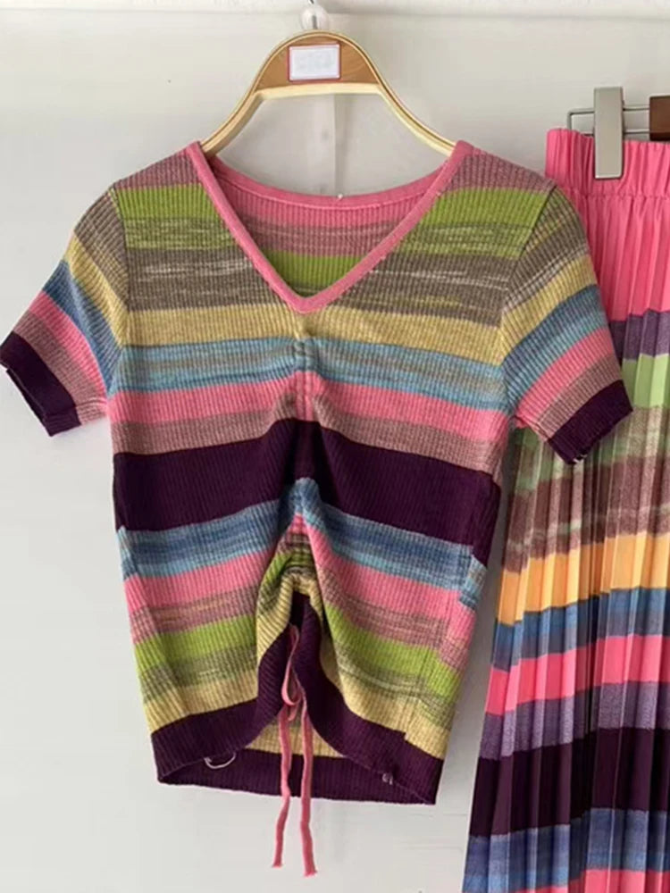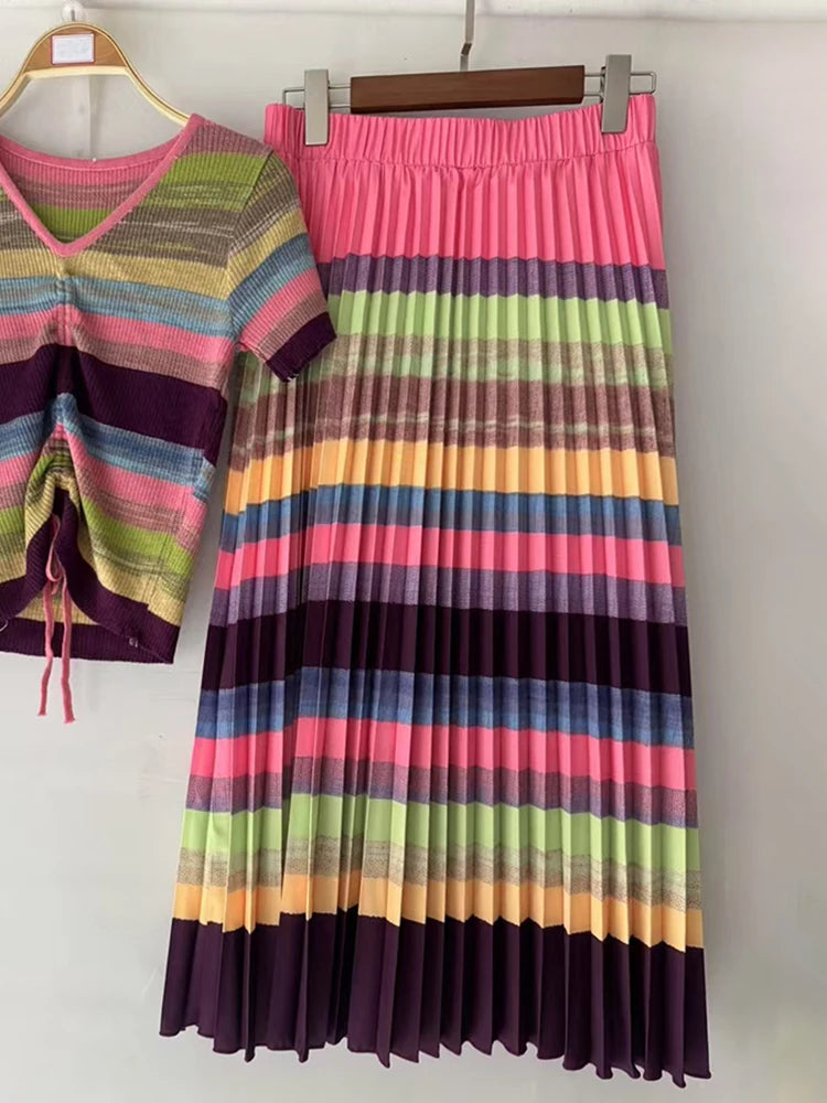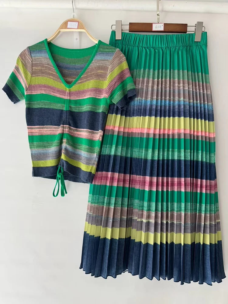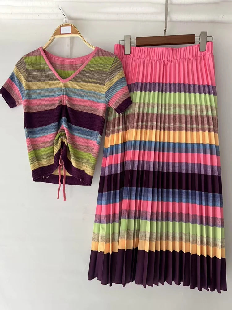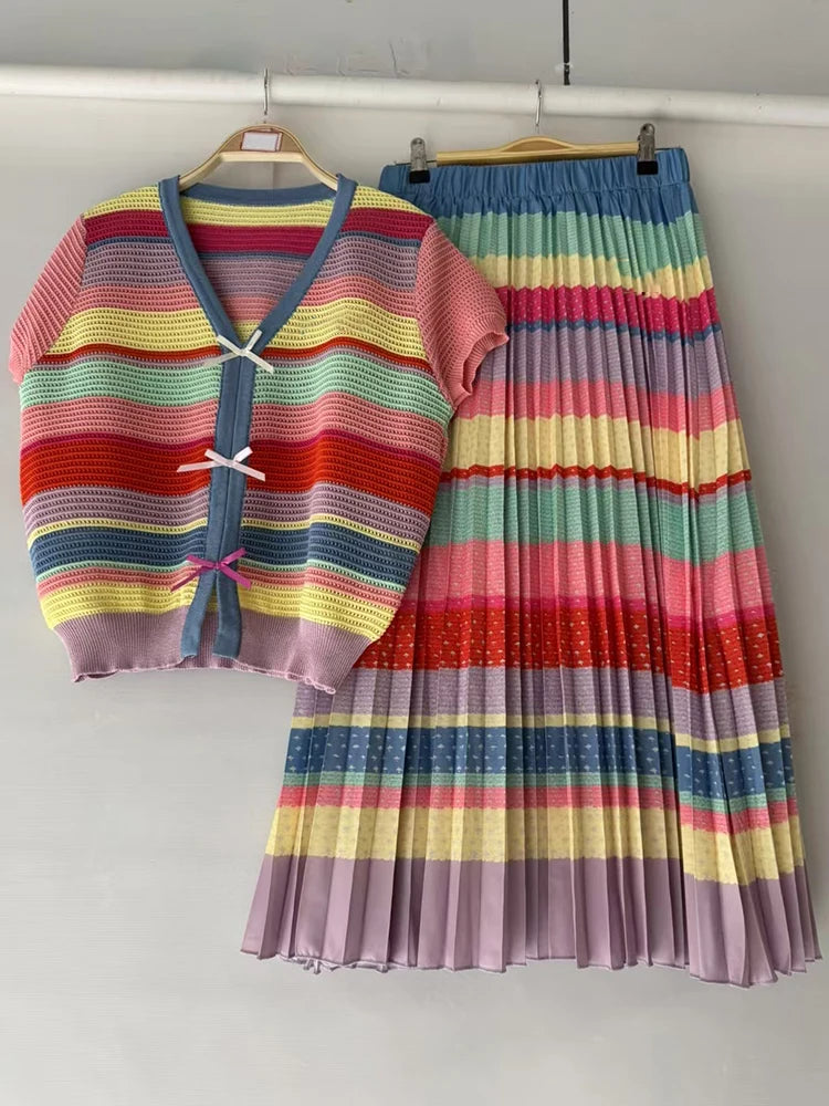 The Angelica two-piece set combines a retro striped knitted yarn pullover with a loose pleated skirt featuring an elastic waistband for a comfortable fit. Designed for summer 2025, this fashion-forward ensemble offers breathable materials and a relaxed silhouette, making it an ideal choice for stylish, effortless warm-weather dressing.
