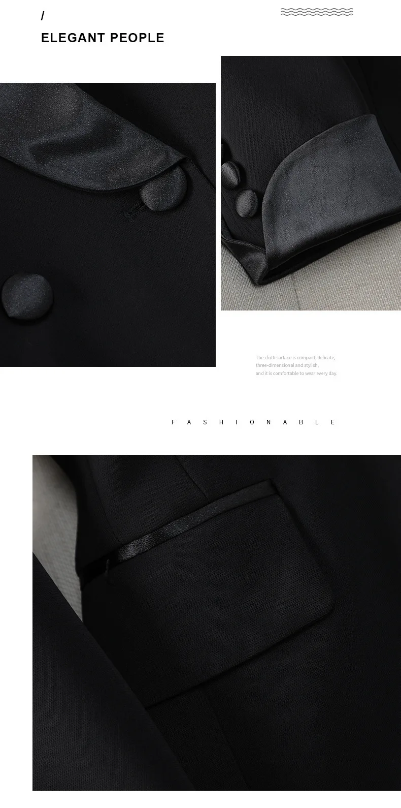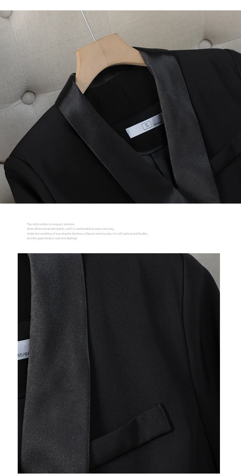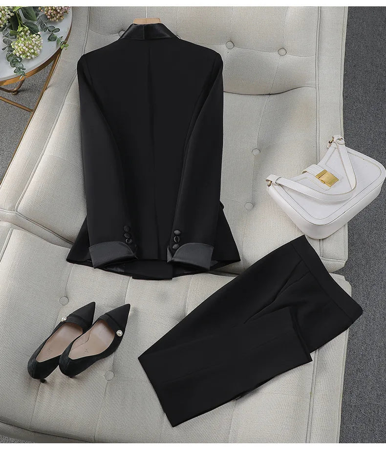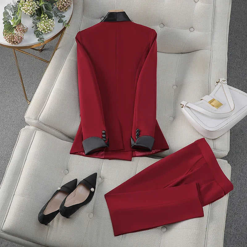 The Anne two-piece suit set is expertly crafted for the professional woman, featuring a tailored blazer and slim-fit long trousers. This combination delivers a sleek, modern silhouette ideal for office environments, providing both style and comfort. Perfect for business meetings or formal occasions, it ensures a polished and confident appearance throughout your workday.