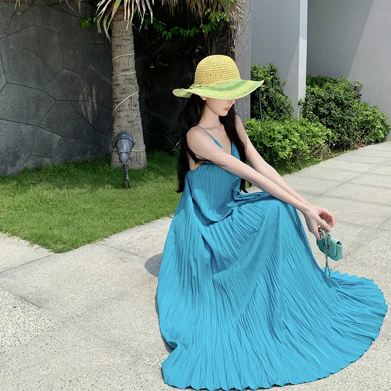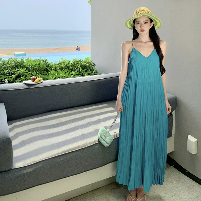 Introducing the Blue Ocean slip dress, expertly designed for both elegance and comfort. Featuring a sleeveless design with pleated detailing and a loose fit, this dress is perfect for any beach outing or casual occasion. Its backless style adds a touch of sexiness, making you feel confident and chic. Available in a beautiful lime color, it's the bestido beach wear choice for any stylish woman.