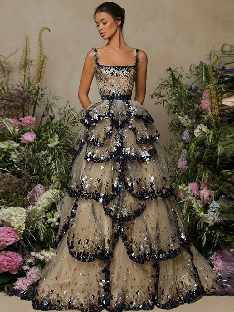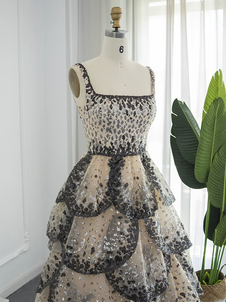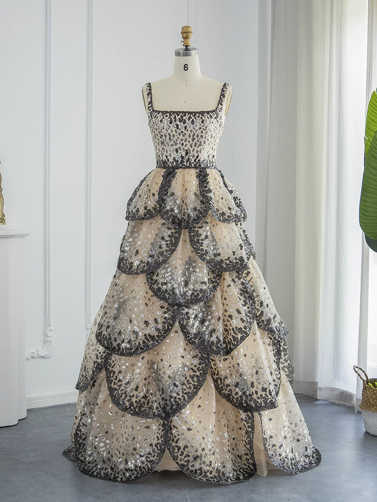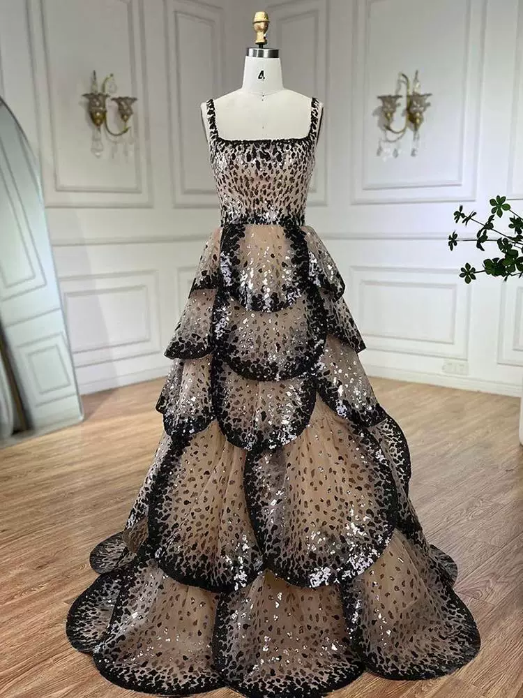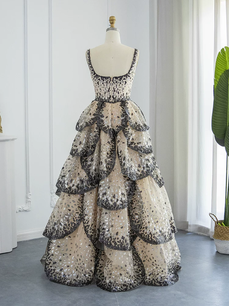 Turn heads at any event with this stunning tiered evening gown. Featuring a unique leopard print design, this dress is crafted with layers of sheer fabric adorned with shimmering sequins for a glamorous effect. The square neckline and sleeveless cut add a modern touch, while the dramatic tiered skirt creates a show-stopping silhouette. Perfect for galas, red carpet events, or any special occasion where you want to make a statement.