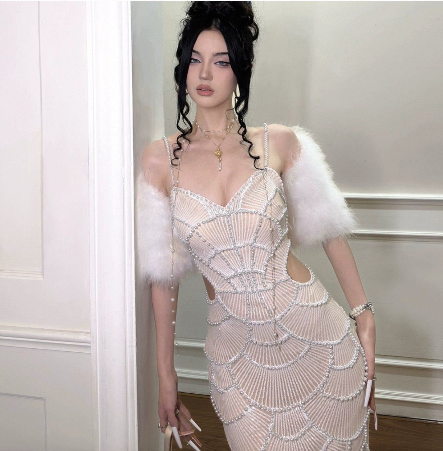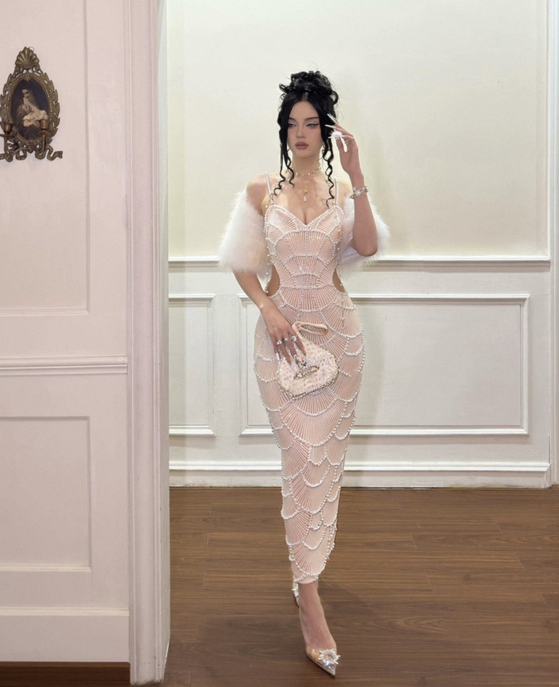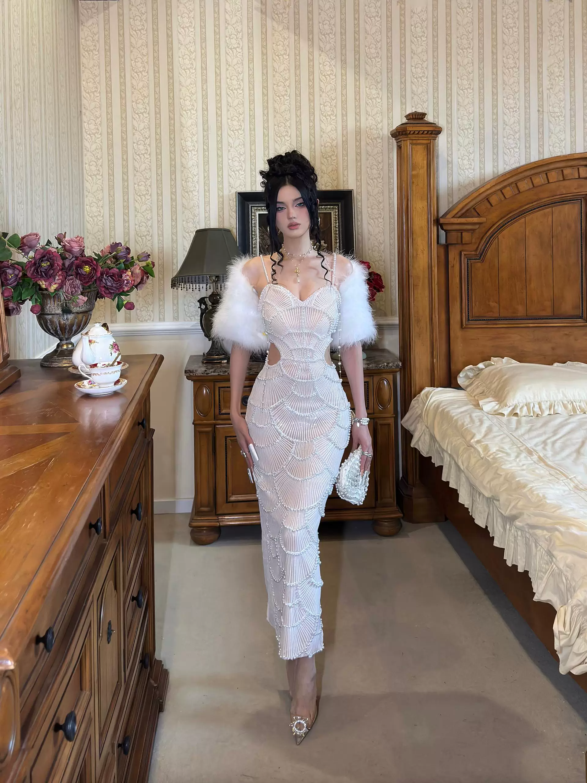 Introducing our Carolina Glamour Pearl Embellished Mesh Dress. Crafted with high-quality mesh and adorned with intricate pearls, this midi dress creates a stunning scalloped pattern that flatters your figure. With a fitted bodice, spaghetti straps, and a sweetheart neckline, this dress exudes romance and elegance for any occasion. Elevate your style and turn heads with this luxurious dress.