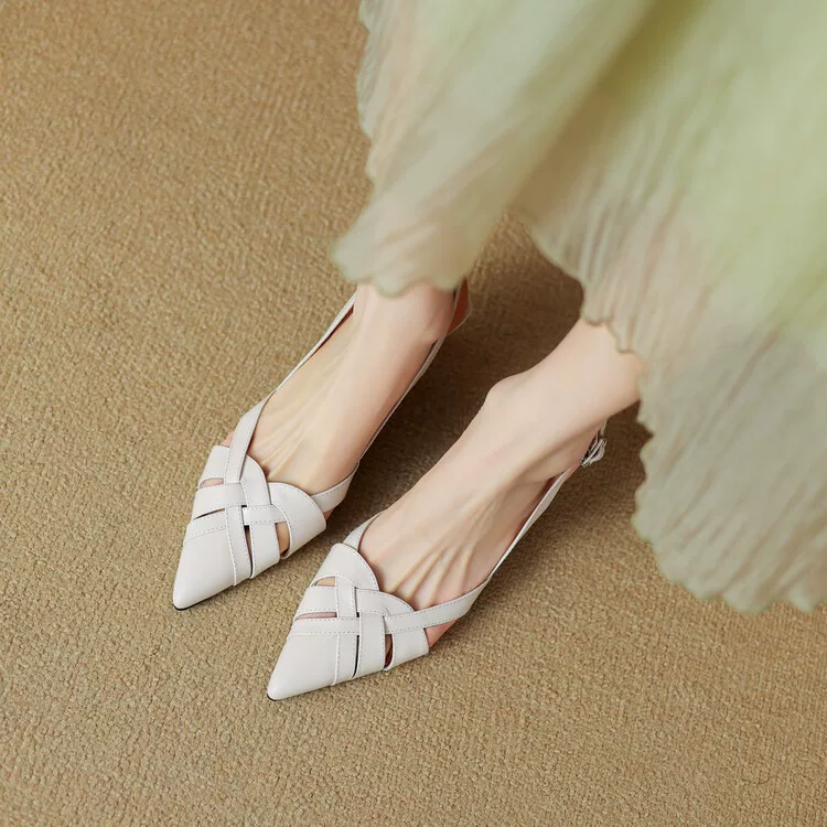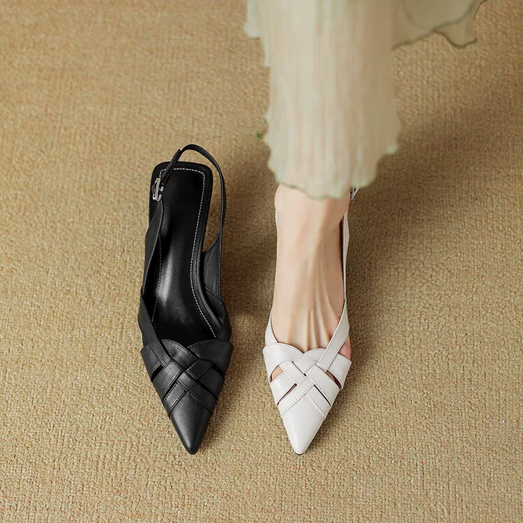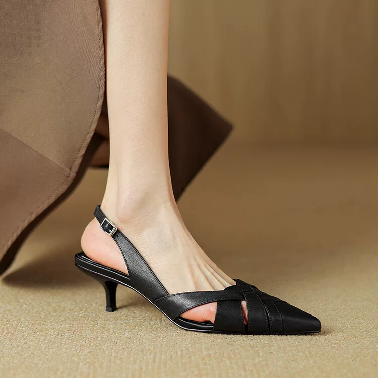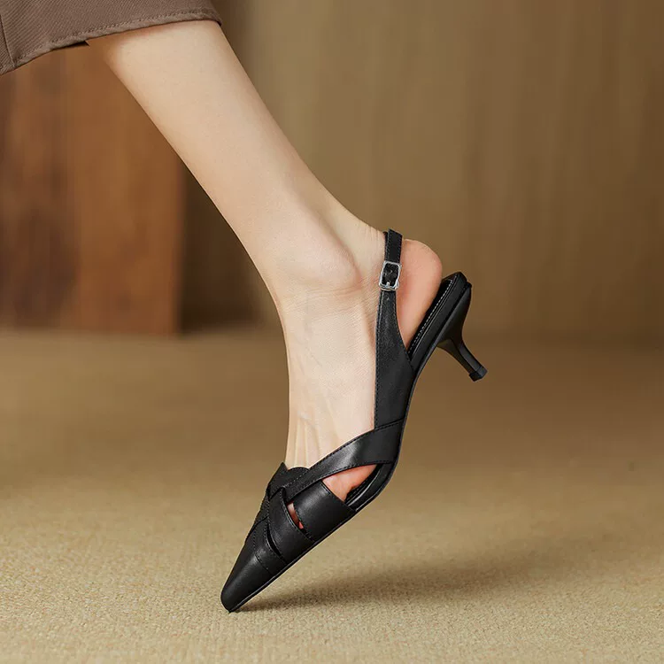 Charmaine sandals feature a mid heel, open toe, and woven straps for a stylish and comfortable fit. The pointed design adds a touch of sophistication. Elevate your look with these on-trend sandals.