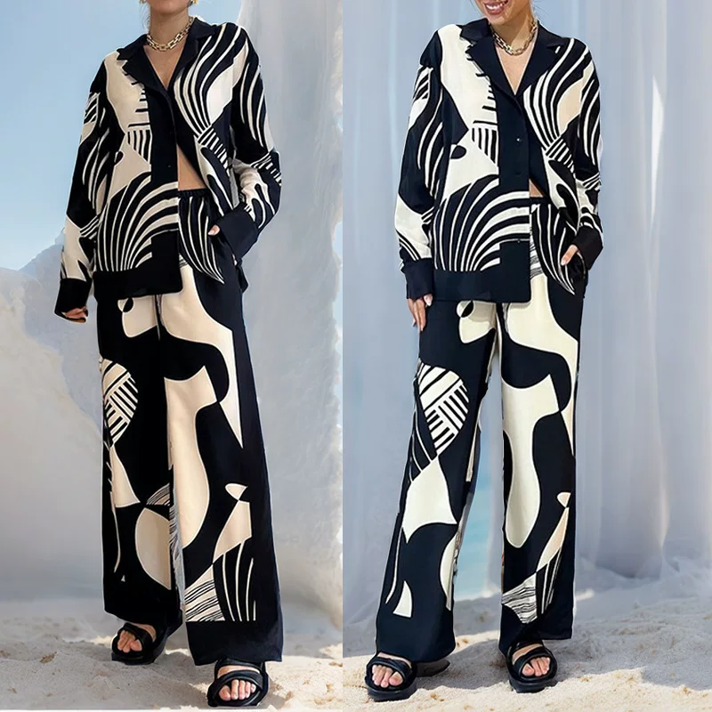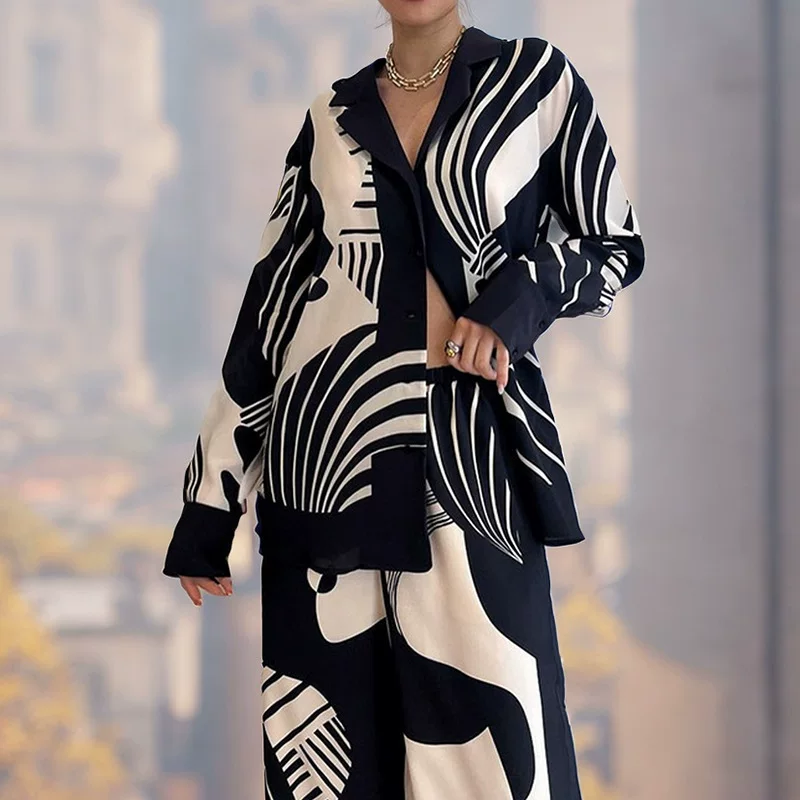 The Cozy Chic 2-Piece Women's Set is perfect for all body types. Made with high-quality, breathable fabric, this set is both soft and comfortable. Featuring a long-sleeve button-down shirt and loose-fitting wide pants, this set has an oversized and flattering style. Ideal for casual or formal occasions. Refer to the size chart before ordering.