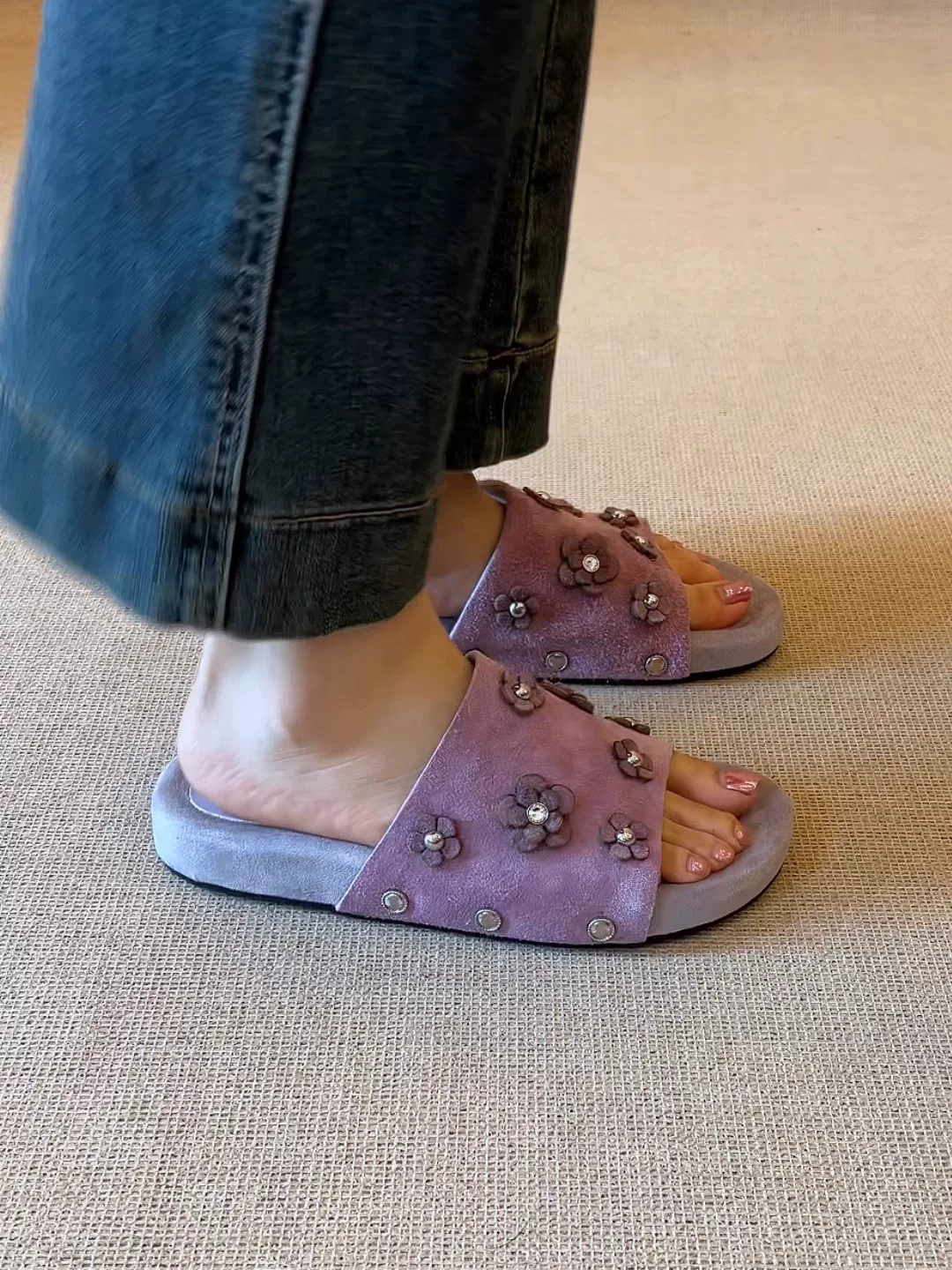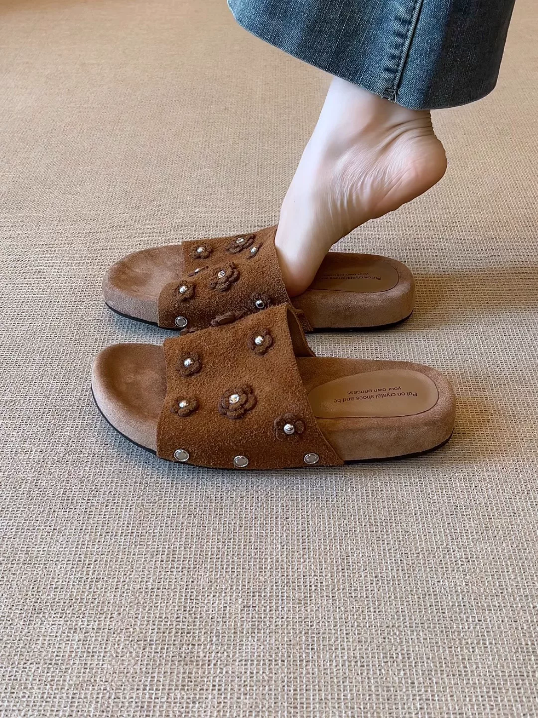 Step into comfort and style with these chic suede slide sandals. Featuring a soft, cushioned footbed and a wide strap adorned with playful flower embellishments and metallic studs, these slippers are perfect for everyday wear. The easy slip-on design makes them ideal for quick errands or lounging at home. Pair them with your favorite jeans or a casual dress for a relaxed, trendy look!