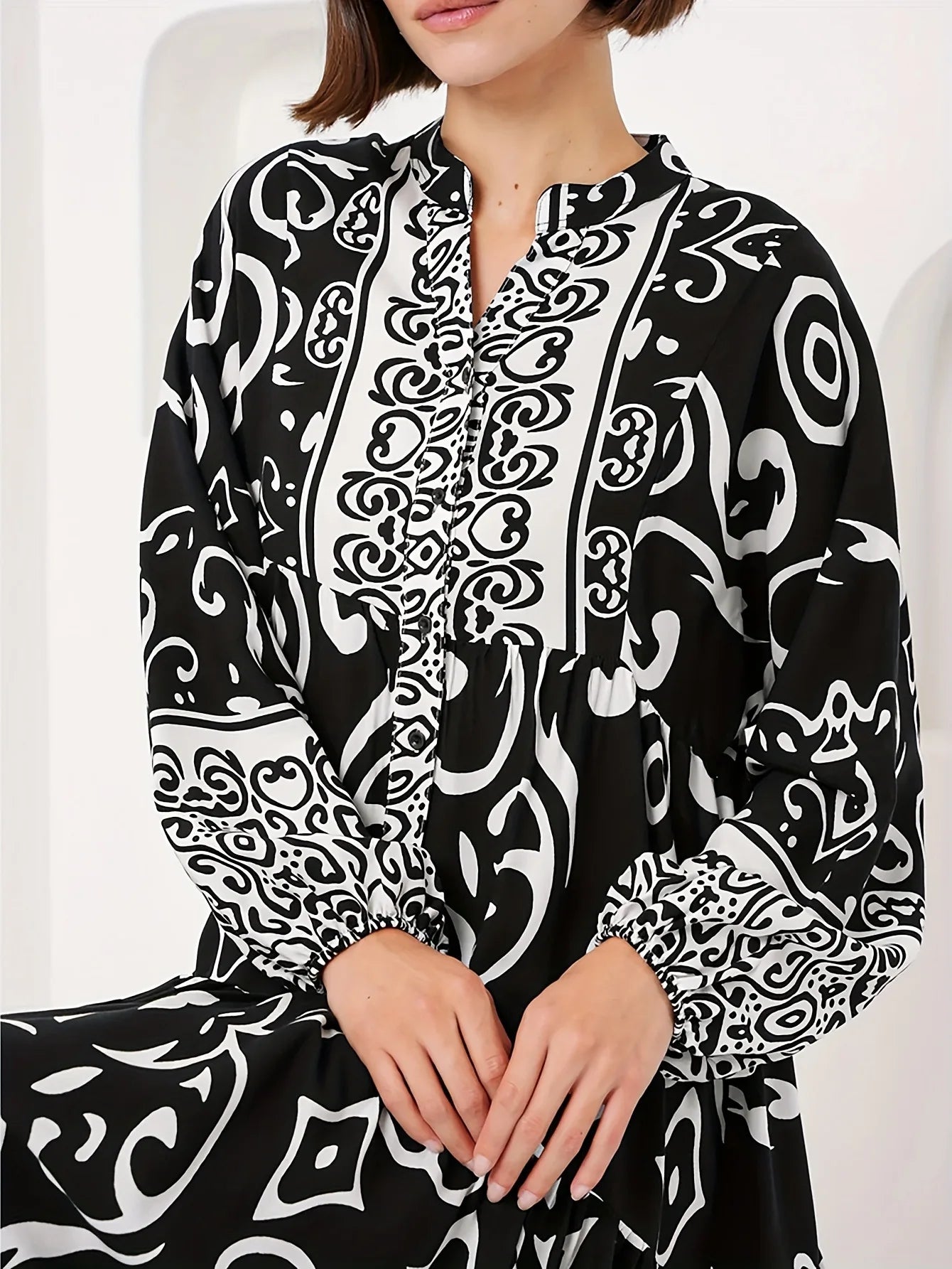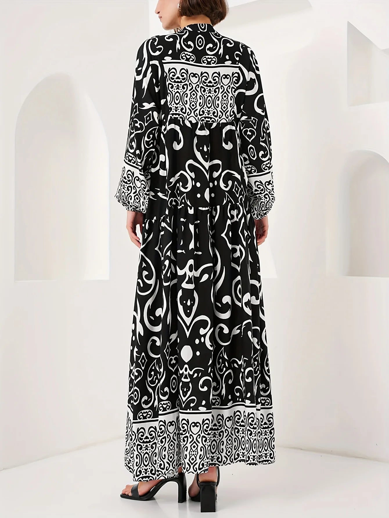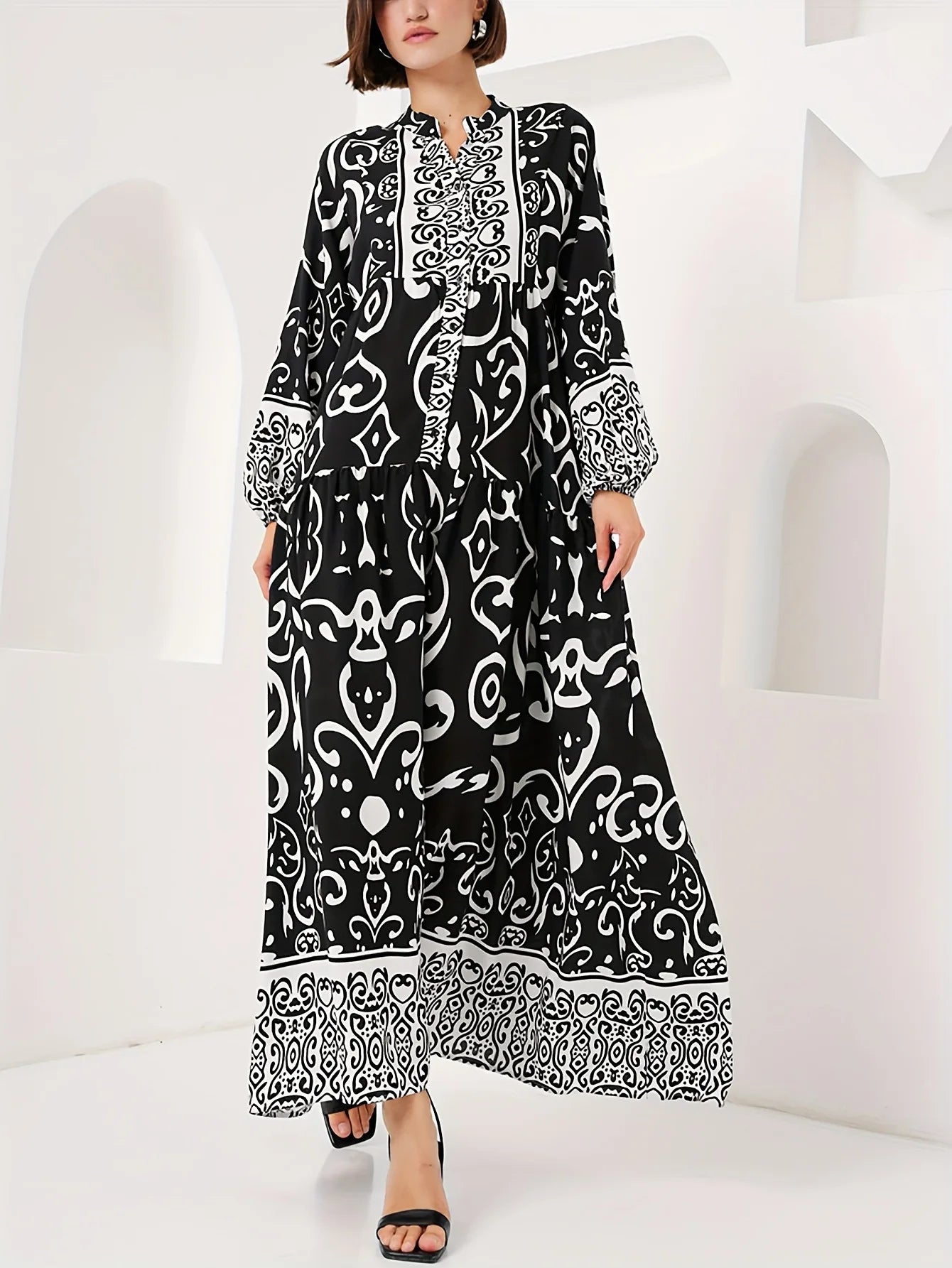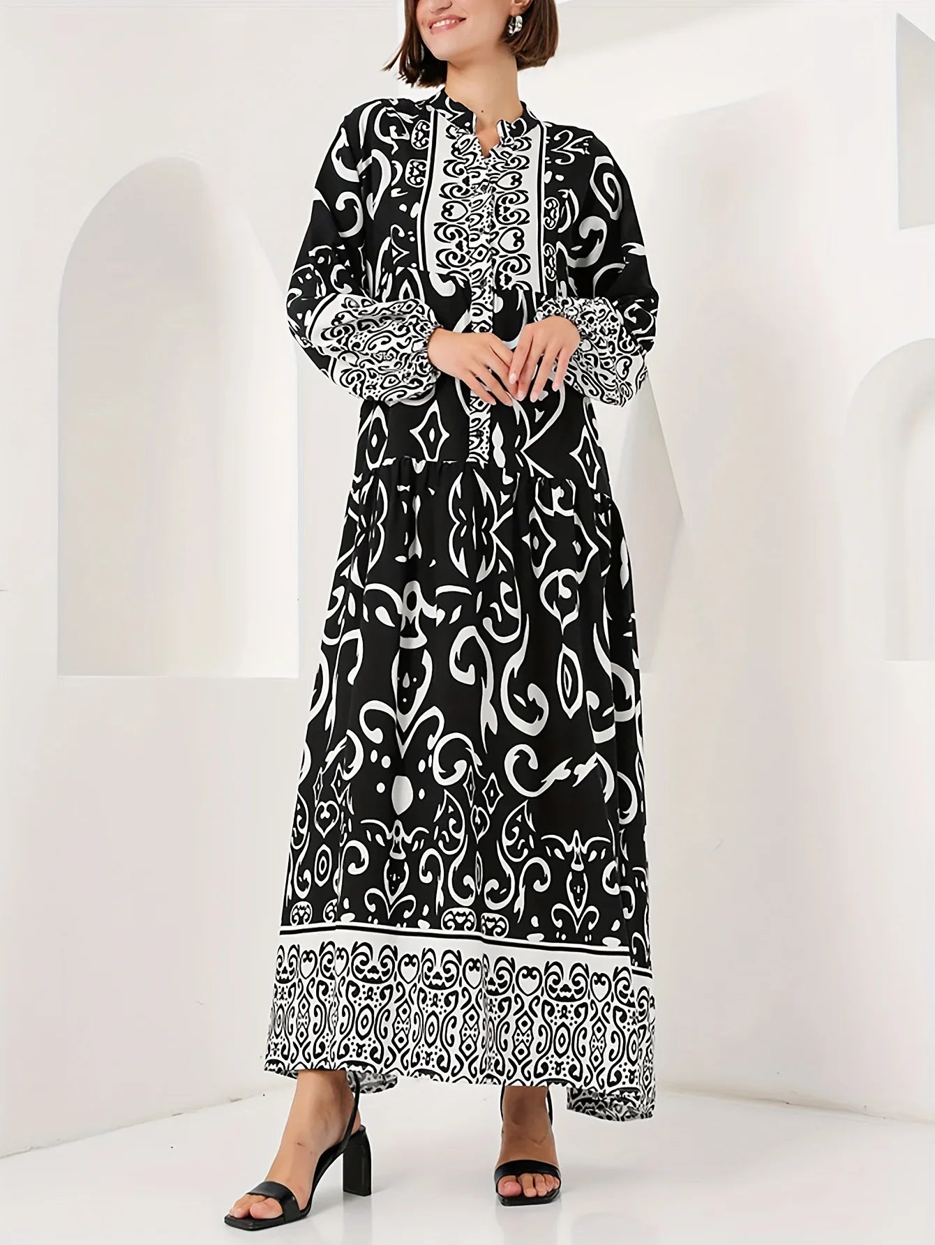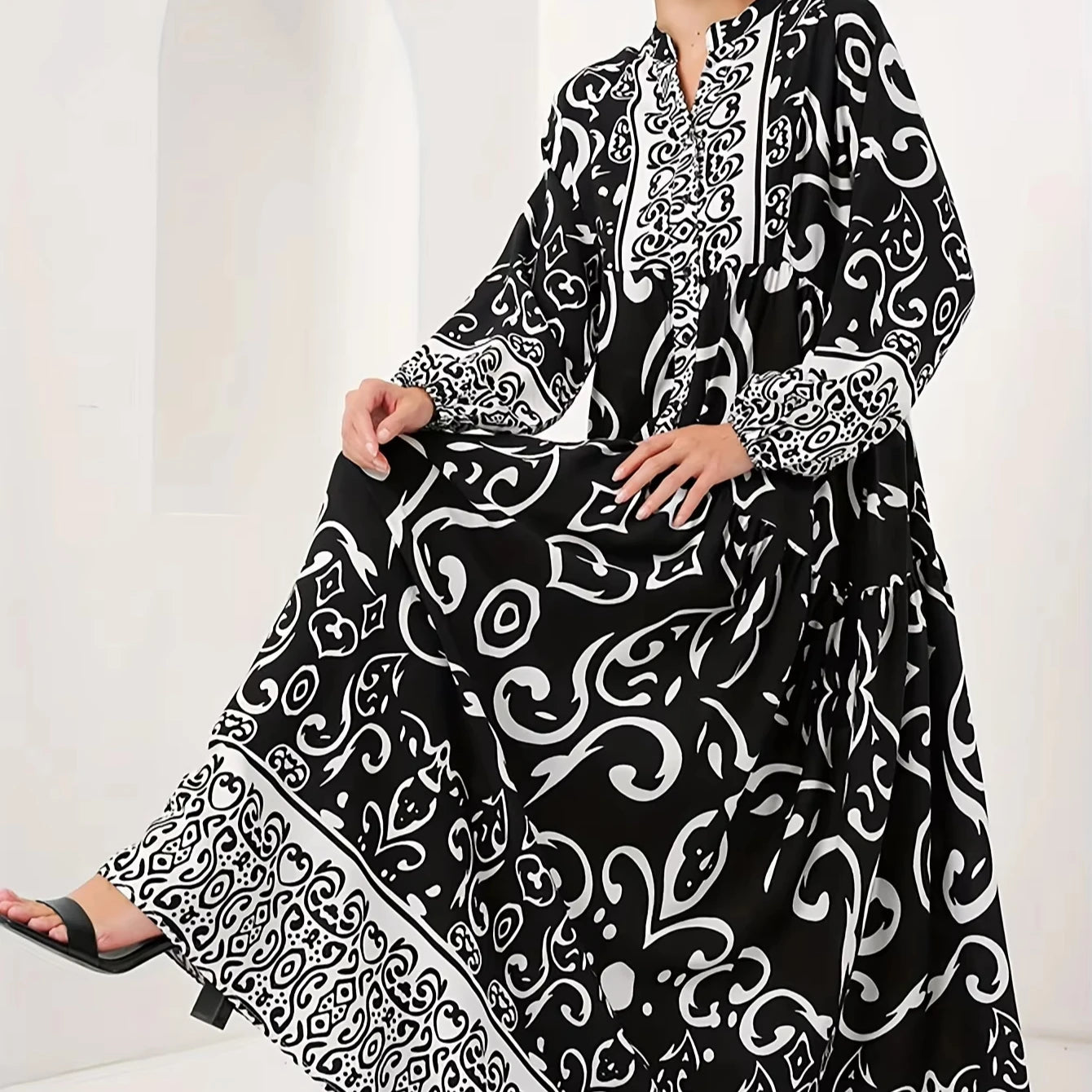 Elevate your wardrobe with Dalia, the elegant loose long dress. Designed to keep you comfortable and stylish, this long sleeve V-neck dress features a beautiful Islamic print and is perfect for any occasion. With its Middle Eastern Arab influence and flattering fit, Dalia is a must-have in every fashionista's collection.