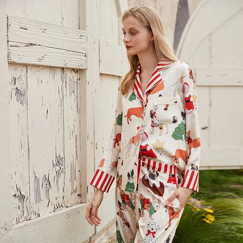 Embrace cozy autumn nights with this women's satin pajama set featuring a charming dog print Christmas theme. The long-sleeve top pairs with elastic-waist pants for a comfortable, breathable fit that supports restful sleep and relaxed home wear.