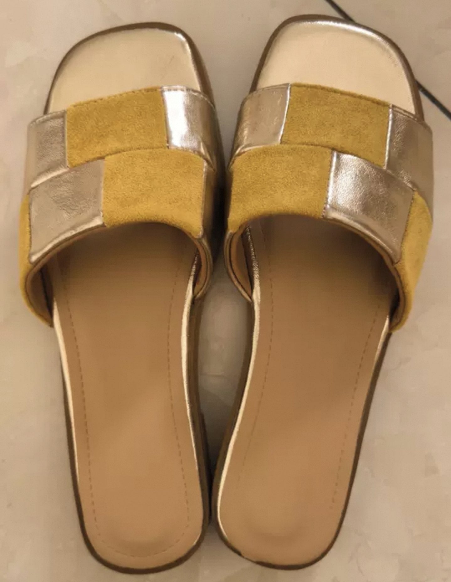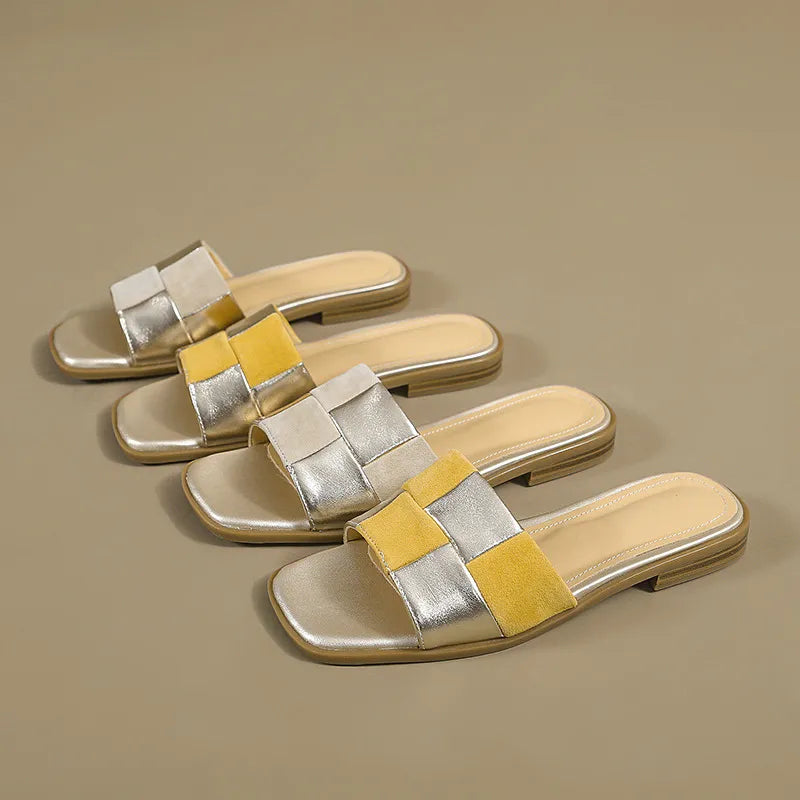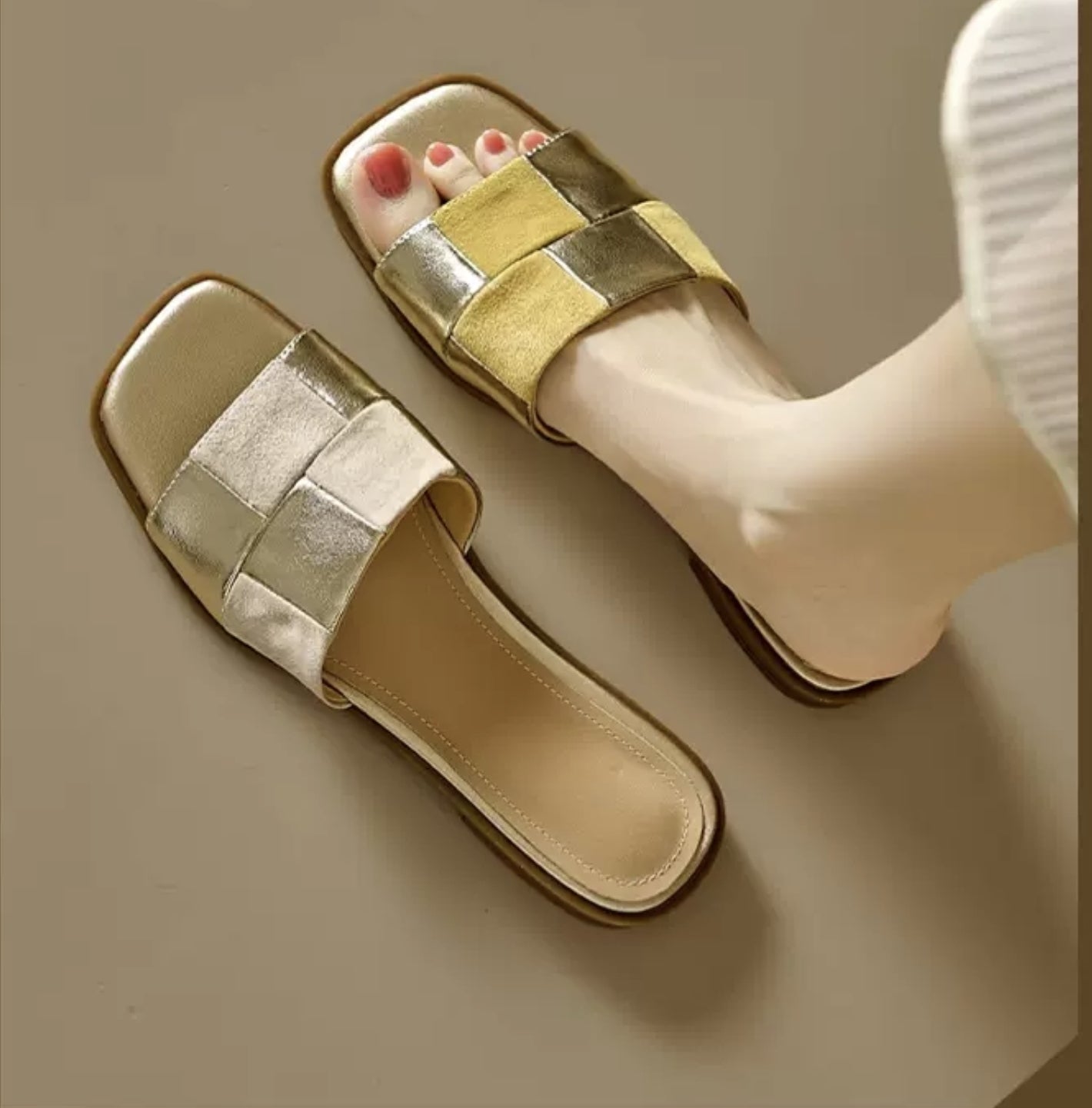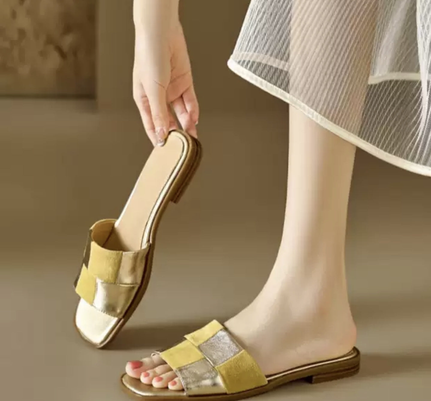 Step into summer with these chic woven flat sandals, available in two stunning colors: yellow and silver. Featuring a stylish checkered design with a mix of metallic and suede-like textures, these sandals are perfect for adding a pop of color and shine to any outfit. The open-toe, square design and comfortable flat sole make them ideal for all-day wear. Pair them with your favorite dress or casual look for effortless style!