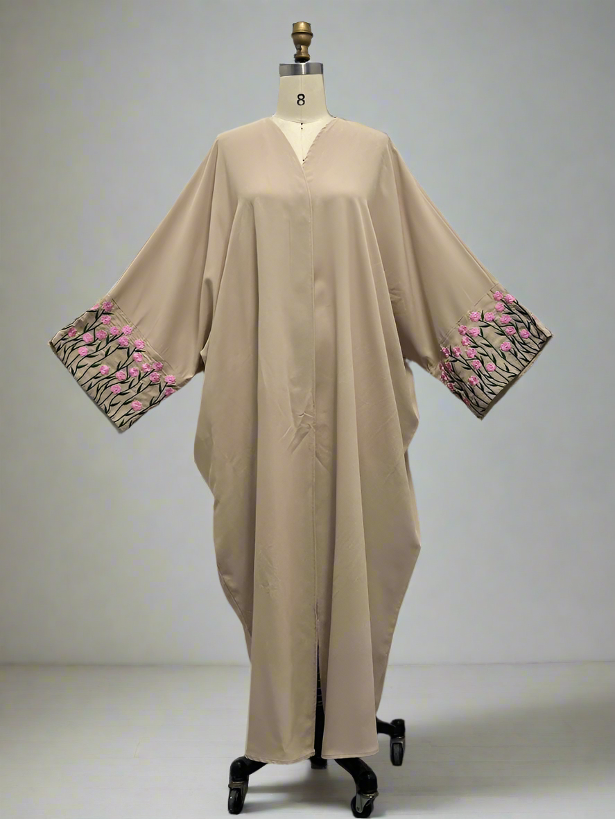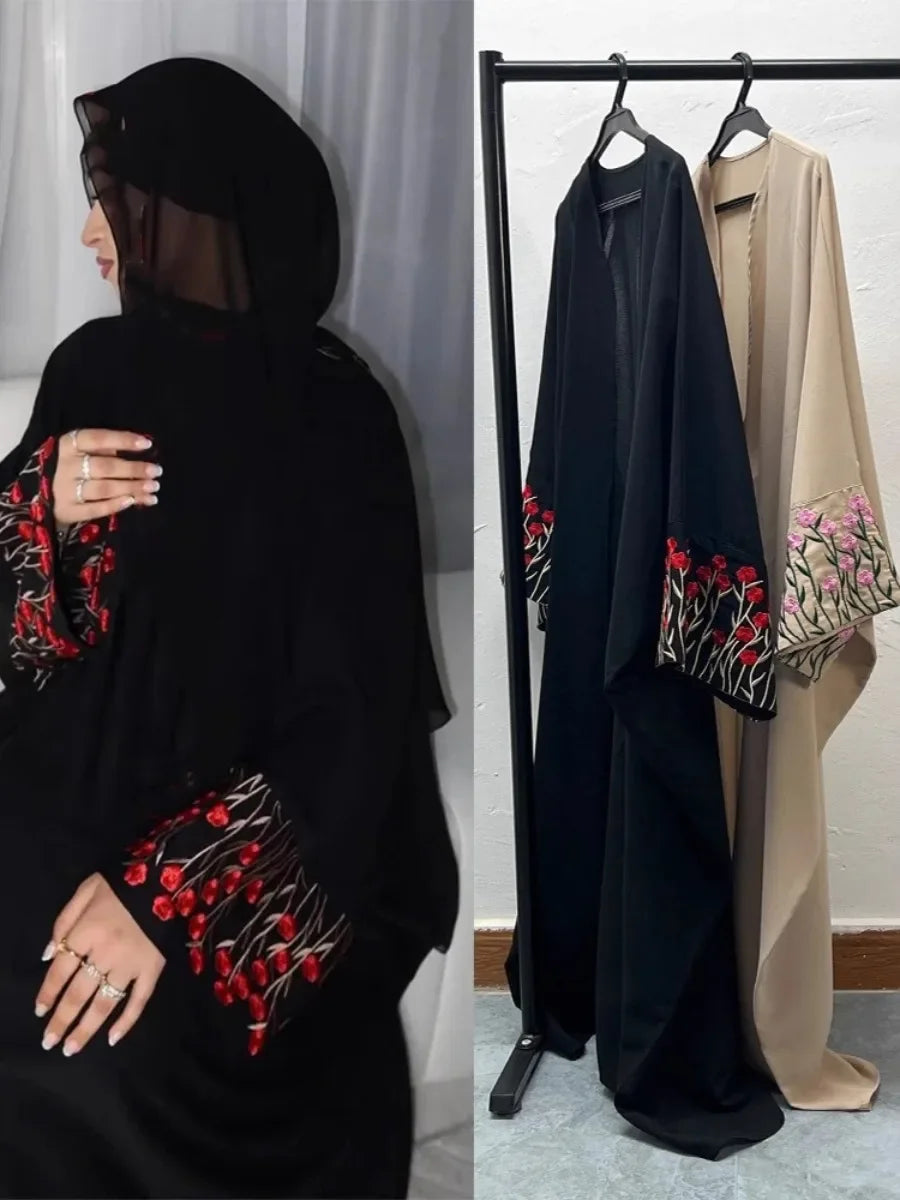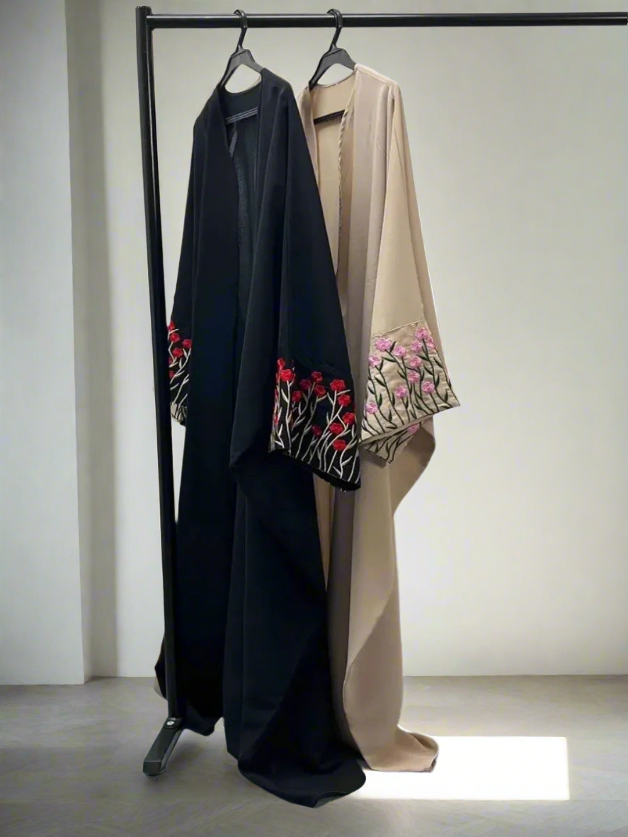 Elevate your style with our elegant abayas, featuring beautiful floral embroidery on the sleeves. Available in classic black and beige perfect for any occasion!