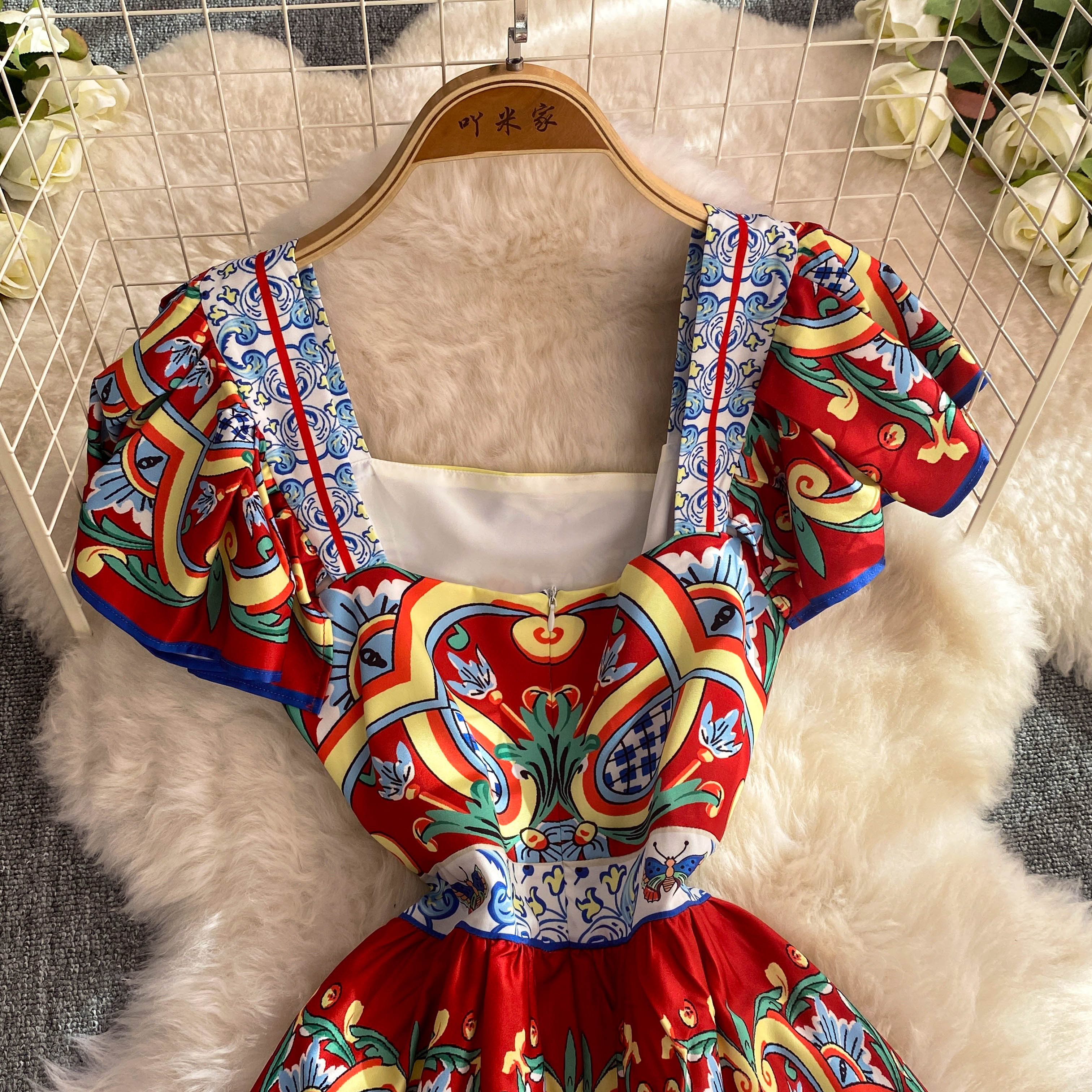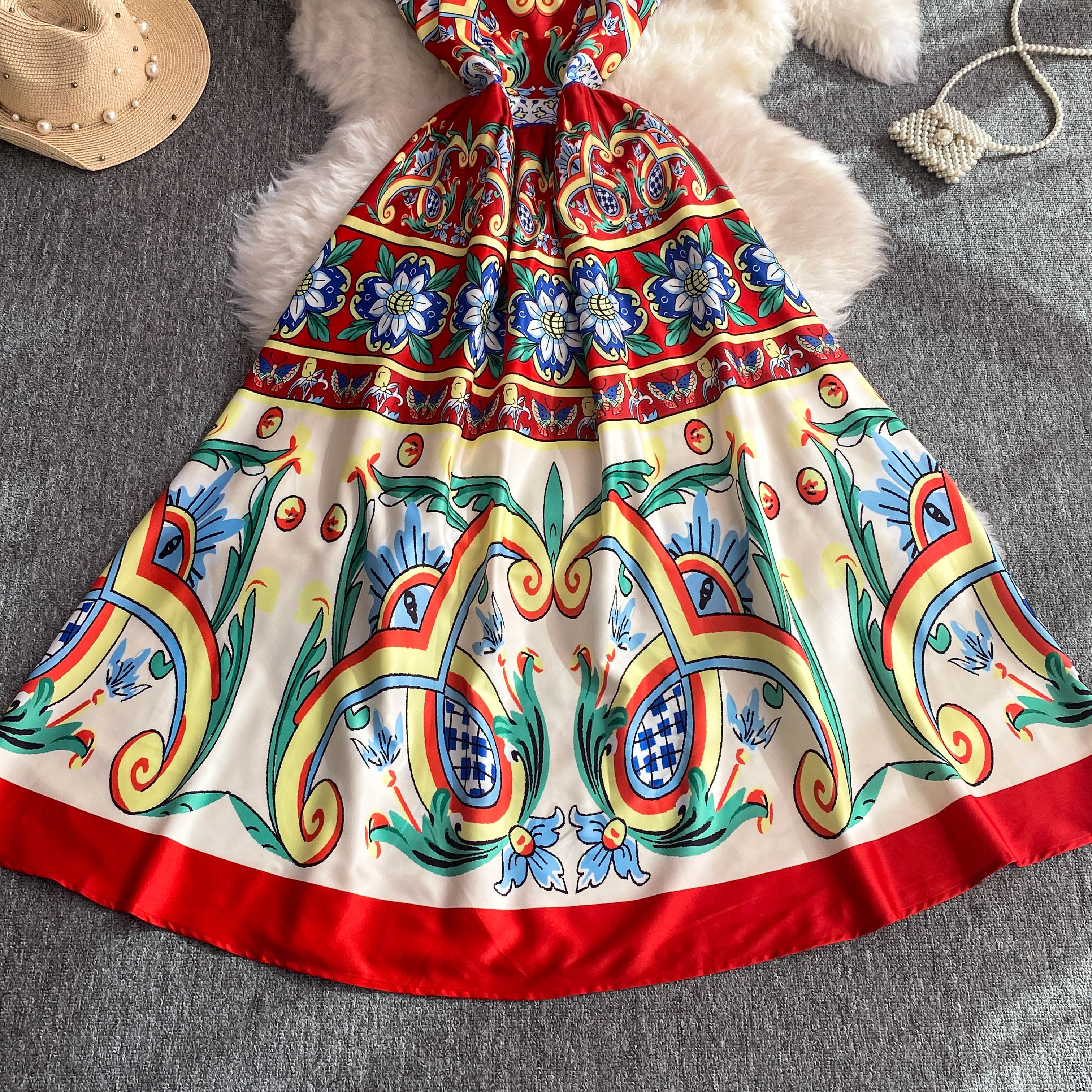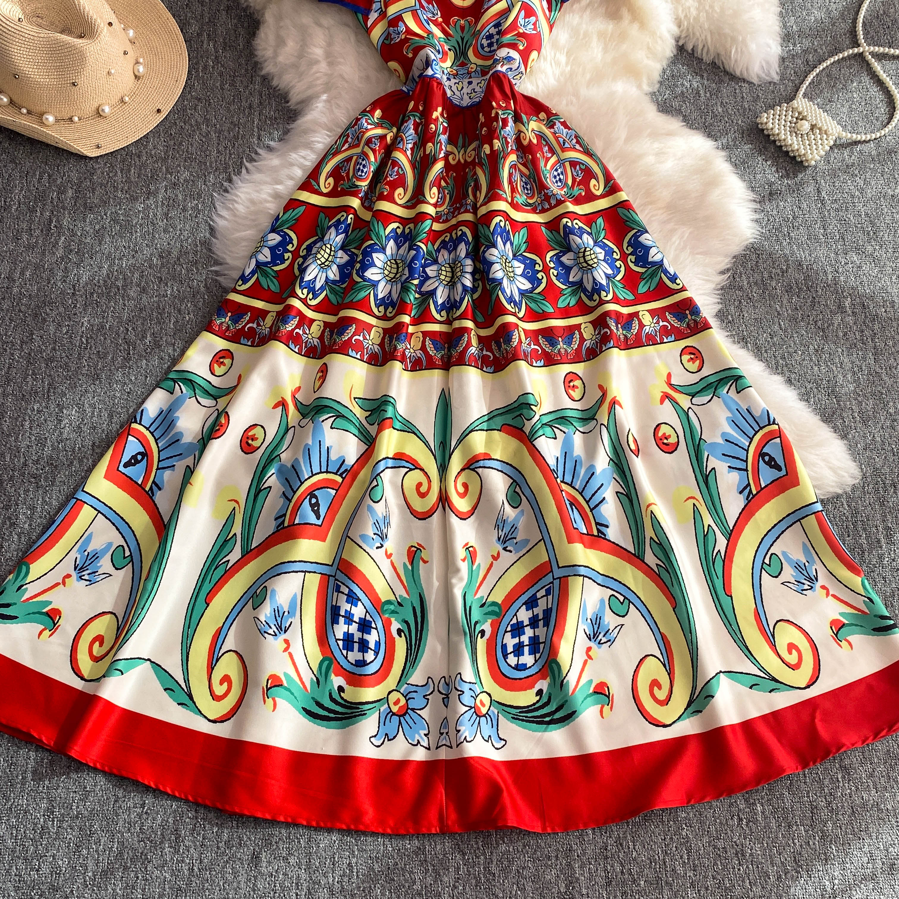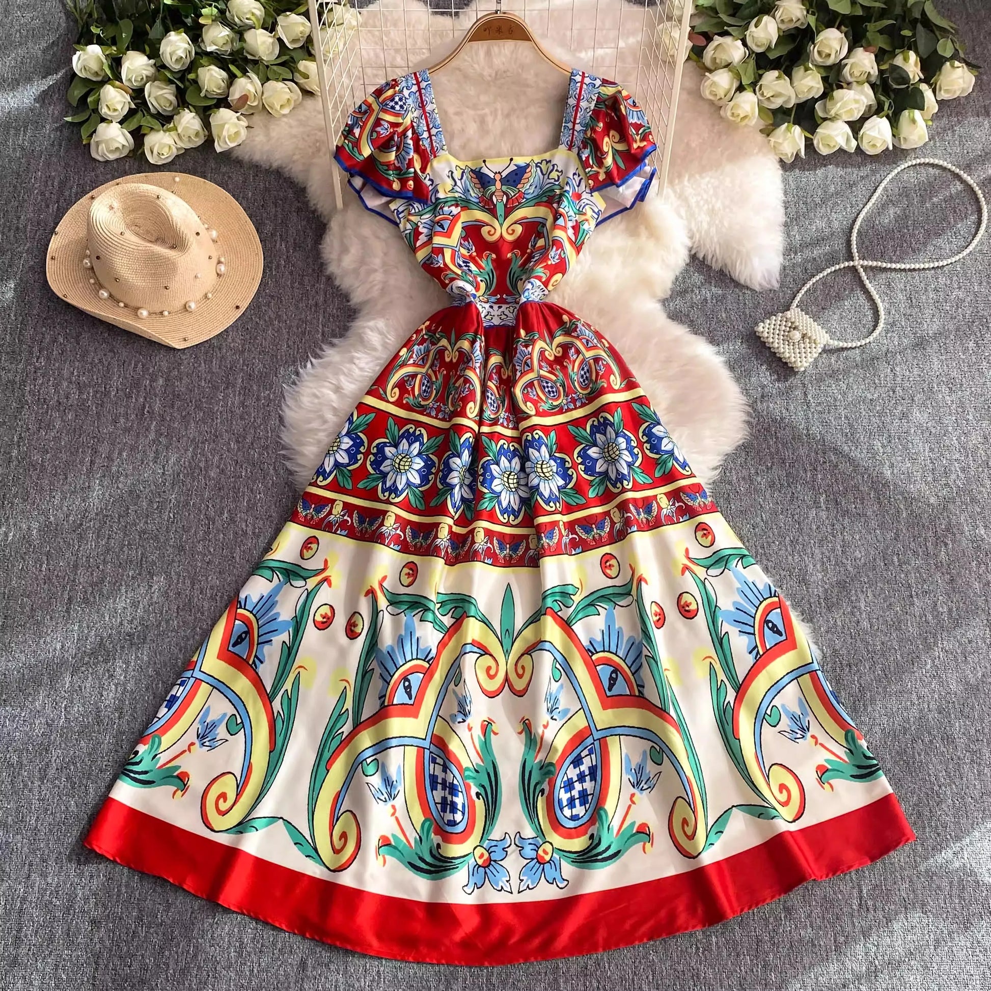The Faye dress features a flattering slash neckline and short sleeves, designed to enhance your silhouette with a bodycon fit. Its classic floral print and ruffle accents bring a touch of elegance, while the pleated maxi length adds graceful movement. Perfect for summer, this dress combines style and comfort for versatile wear from day to evening events.