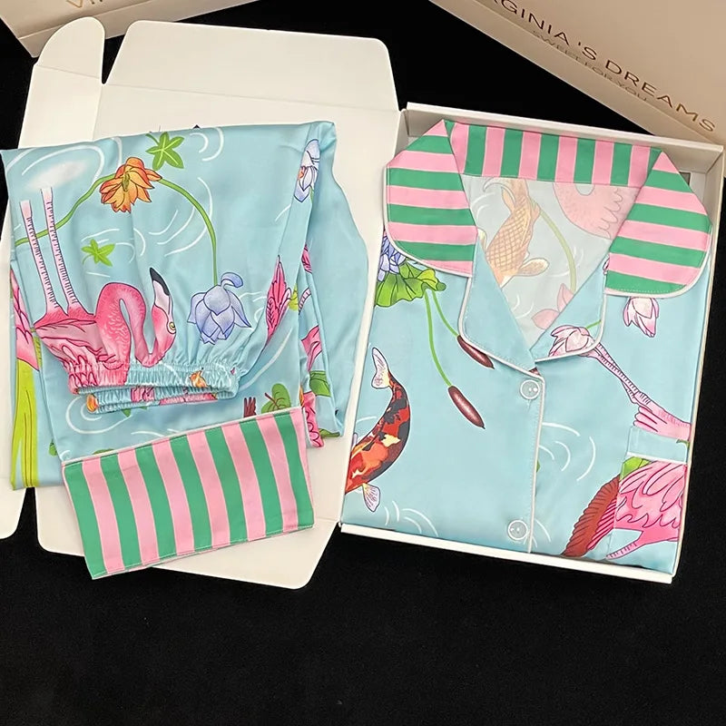 This long-sleeved women's pajama set features soft, breathable senior sense fabric and a stylish flamingo print, ideal for spring and summer comfort at home.
