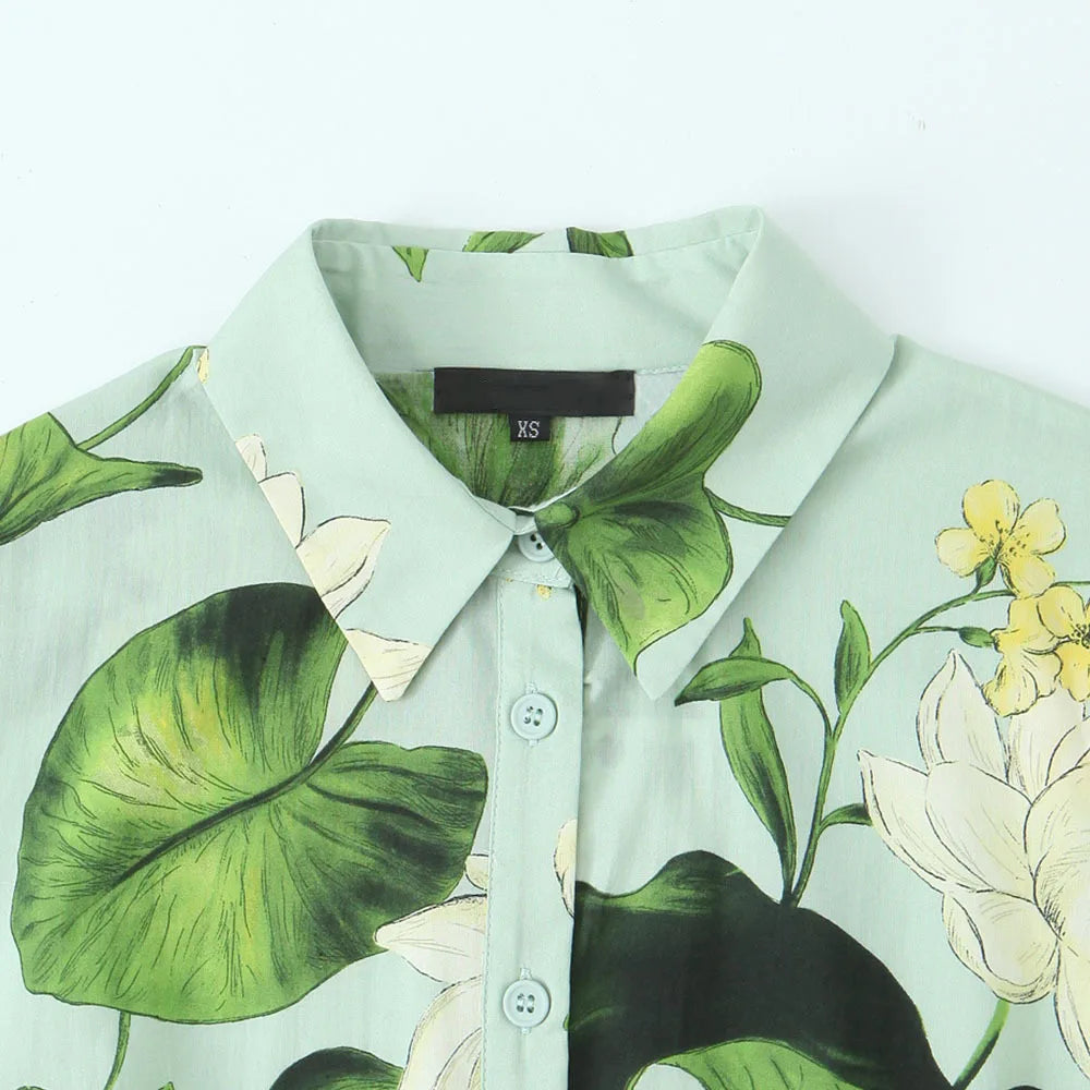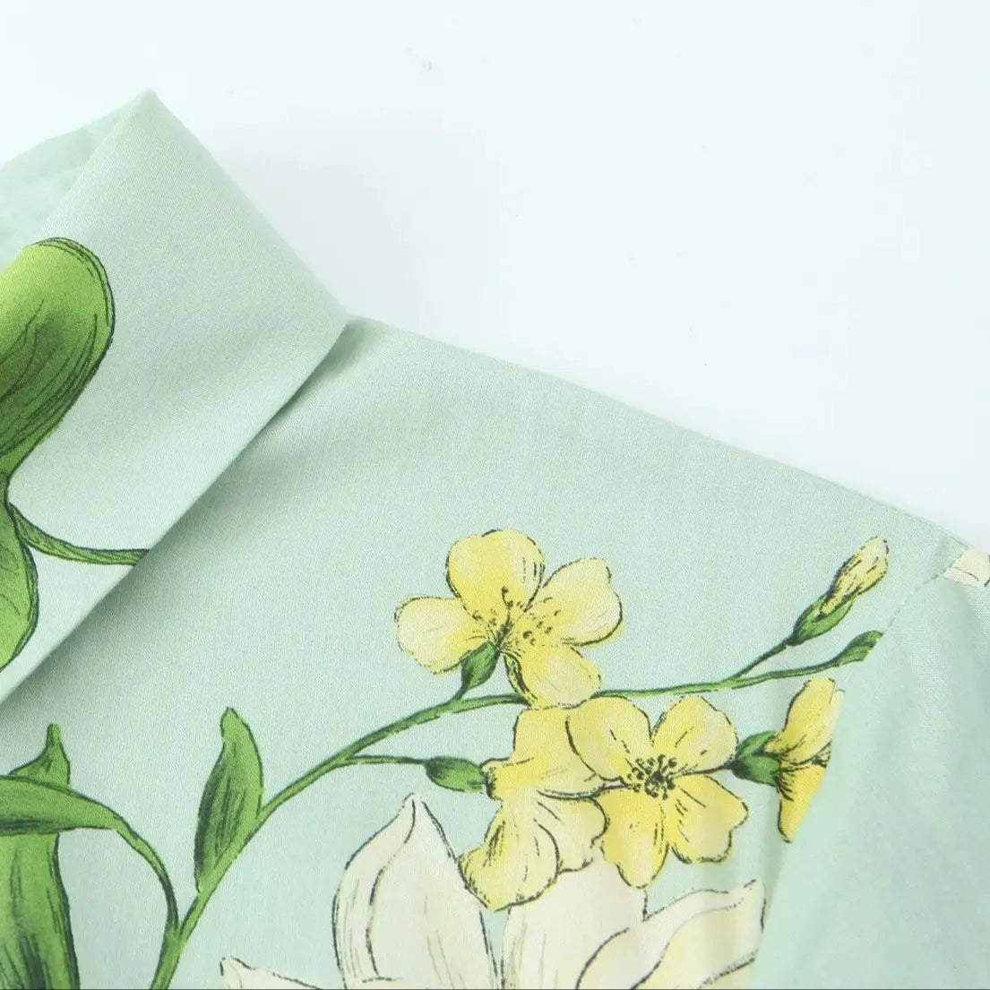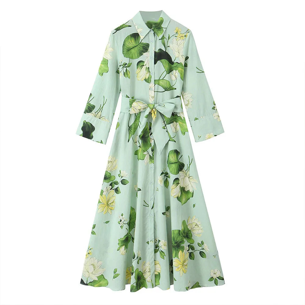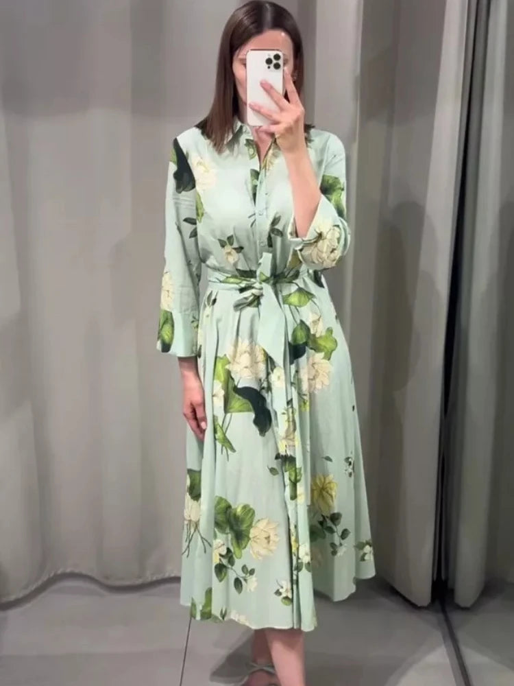 The Gemma dress is a sophisticated summer essential, featuring a delicate floral print on a breathable fabric. Designed with a slim lapel collar, long sleeves, and a single-breasted front, it offers a polished yet comfortable fit. Its mid-waist cut and pleated A-line silhouette enhance the figure gracefully, while the lace-up detail adds a subtle touch of elegance. Perfect for a variety of occasions, this midi dress combines timeless style with modern refinement.
