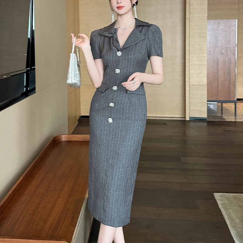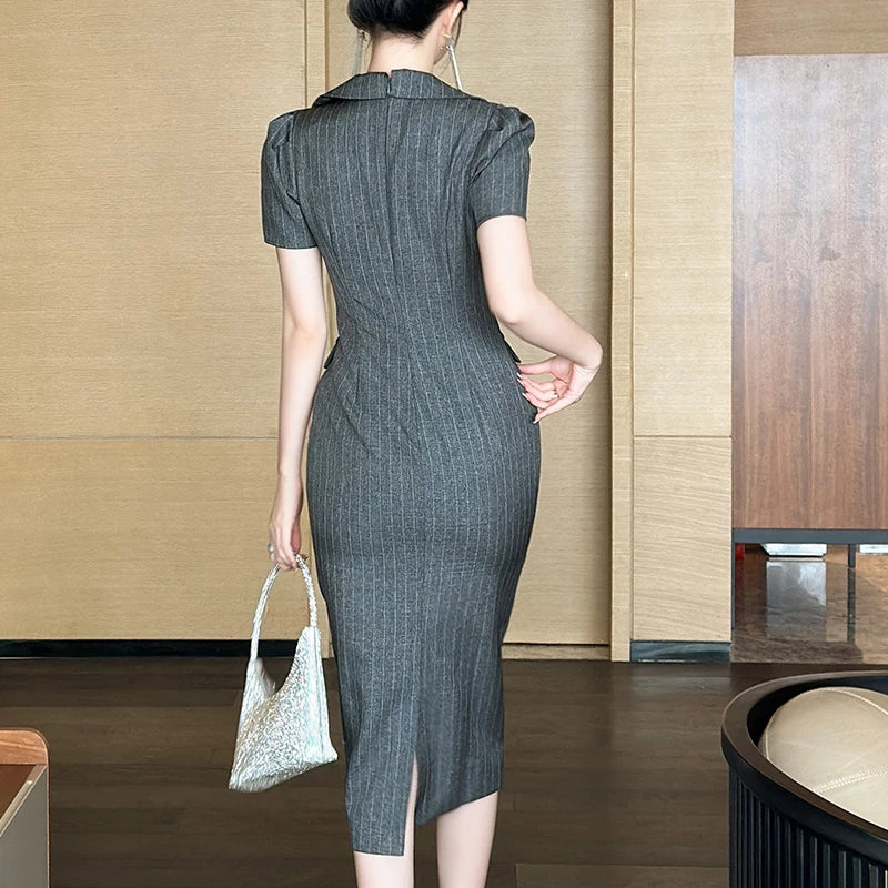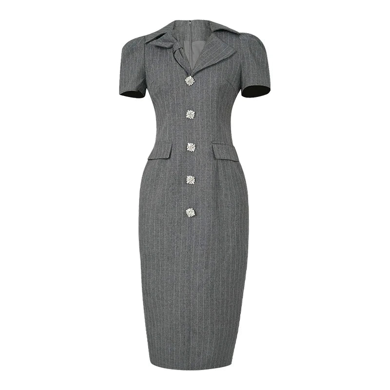 The Glaiza women's striped buttoned midi dress blends the sophistication of a blazer with the elegance of a midi-length silhouette, perfect for formal office settings. Featuring a tailored fit, classic stripes, and a buttoned front, this dress offers a polished and professional look while ensuring comfort throughout the workday. Ideal for ladies seeking a refined and versatile piece that transitions seamlessly from meetings to after-hours events.