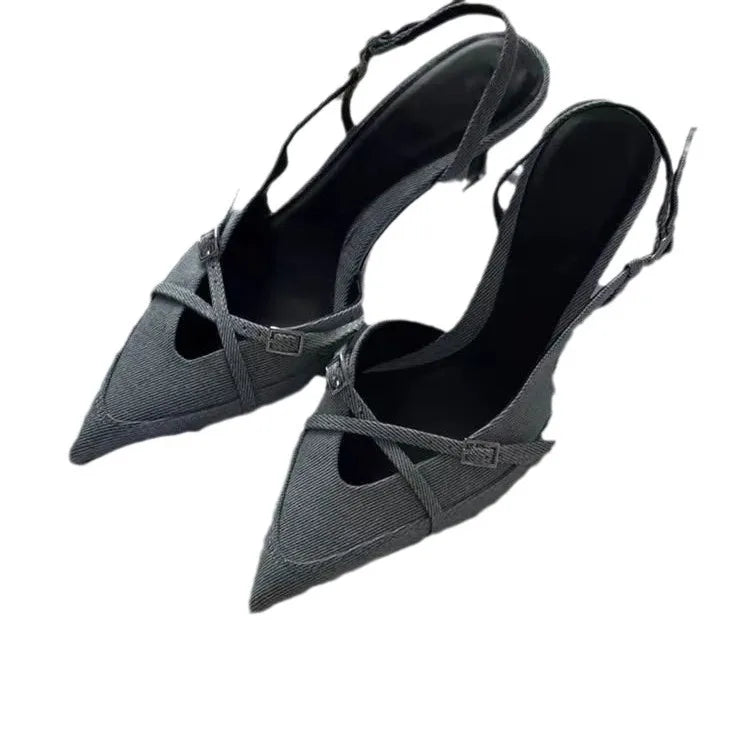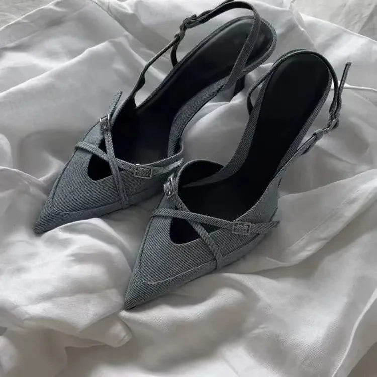 Step out with confidence in the Glydel women's sandals, featuring elegant denim pumps with high, thin stiletto heels. Designed with a comfortable PU insole and secure buckle closure, these slip-on heels combine style and wearability for summer sophistication.