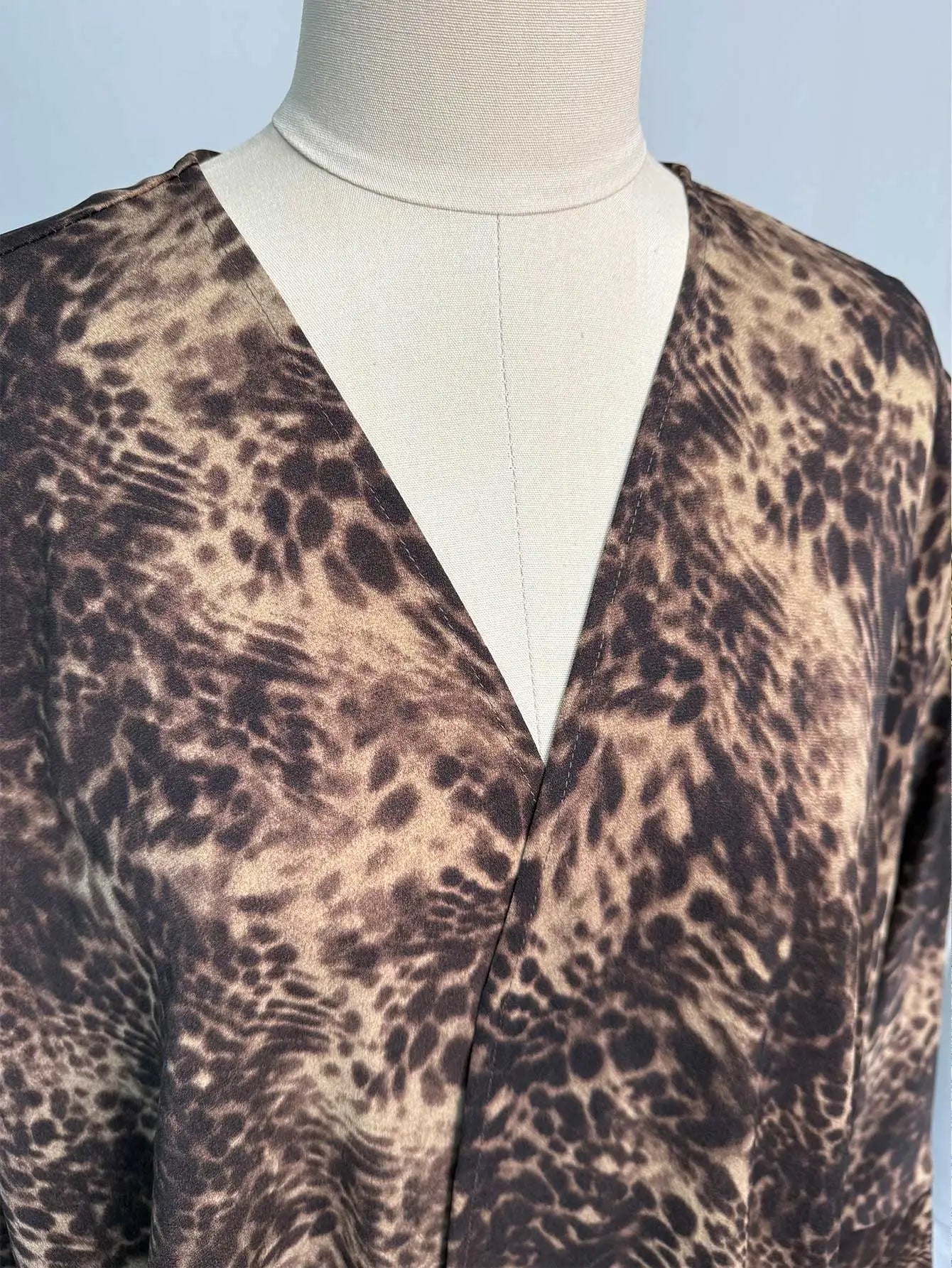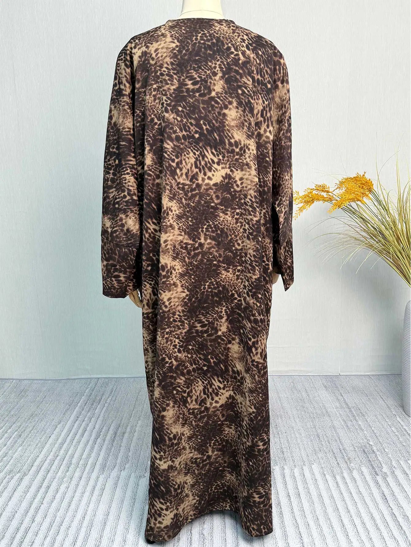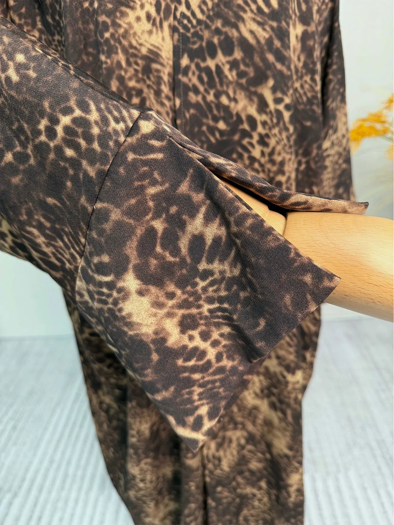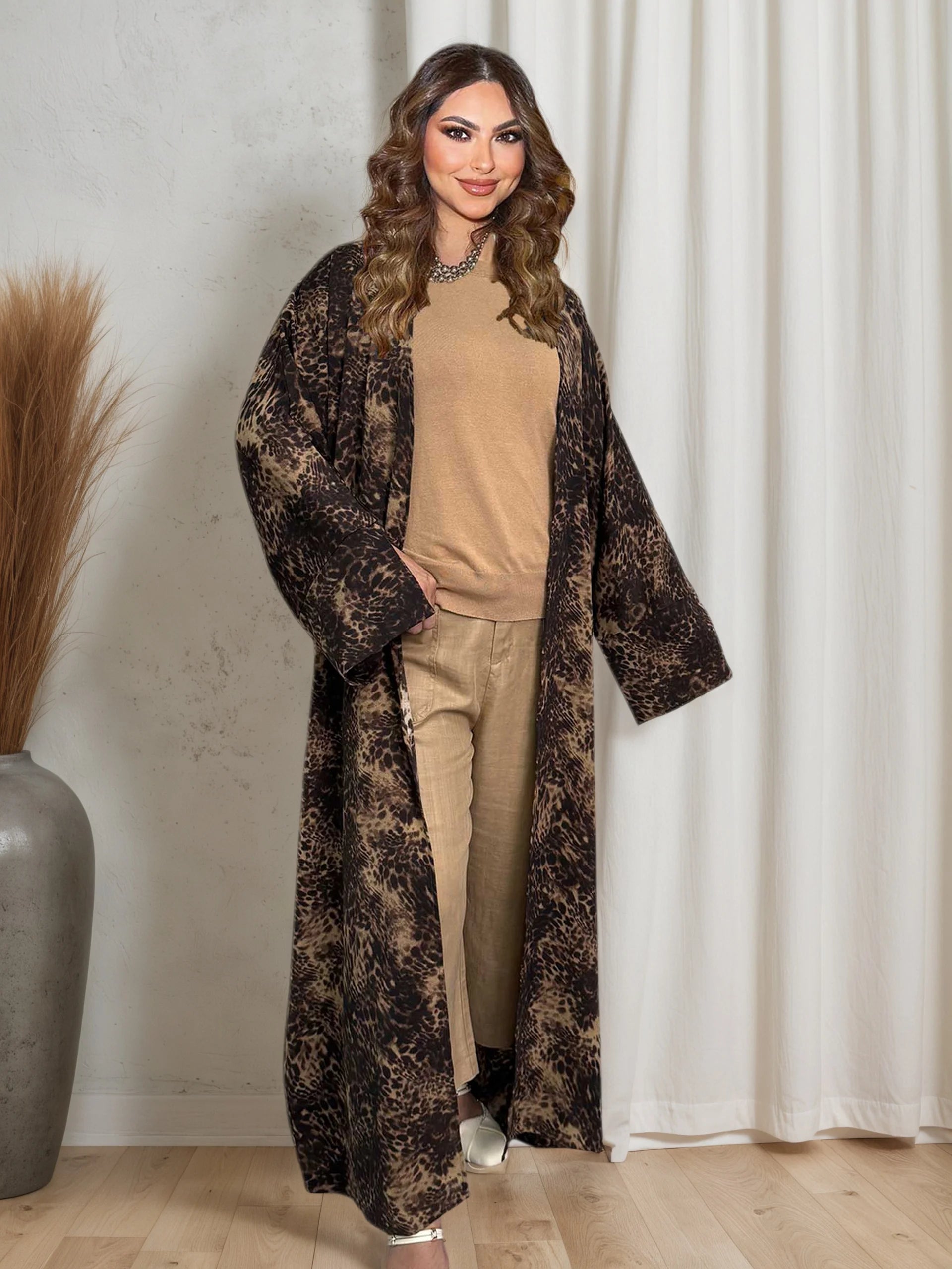 Introducing Haya - the stylish Muslim Abaya Long Cardigan crafted with elegant leopard print for a touch of sophistication. Perfect for modest dressing, this fashionable outerwear for women is a must-have for the religious Islamic clothing collection. Stay stylishly covered with Haya.