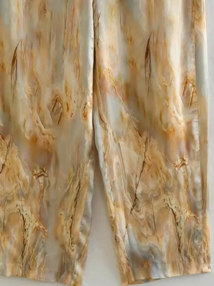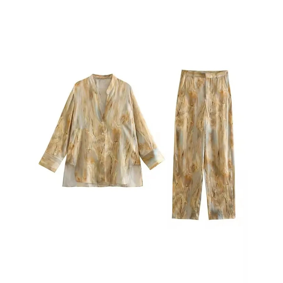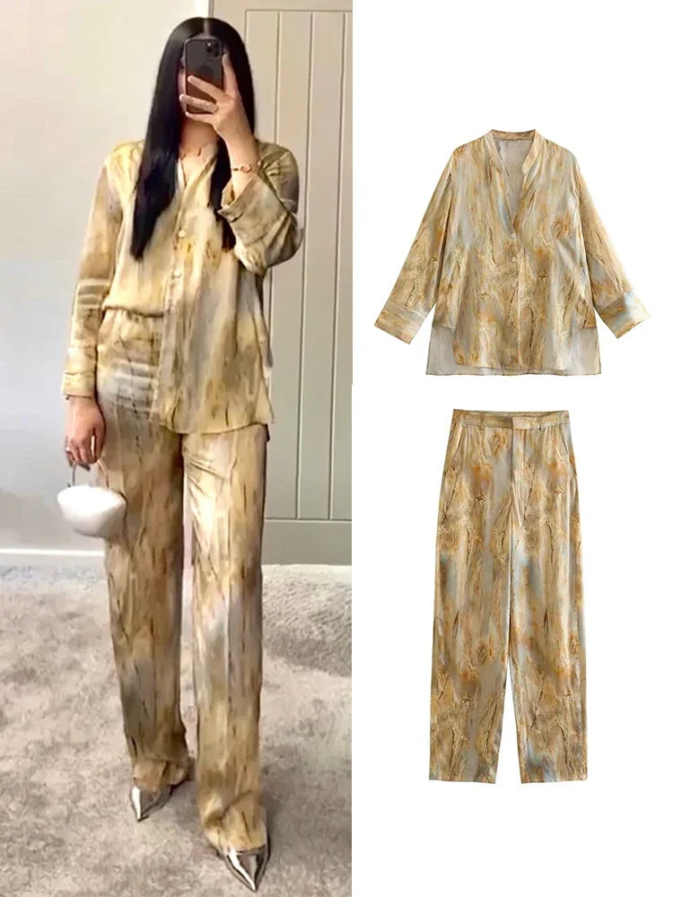 The Helena pajama set offers a sophisticated blend of comfort and style with its two-piece design. Featuring a long-sleeve V-neck top and high-waist loose straight pants, this fashion print ensemble provides a relaxed yet polished look. Designed for women who appreciate elegant loungewear, the breathable fabric and tailored fit ensure comfort and ease of movement, making it perfect for both restful nights and stylish home wear.