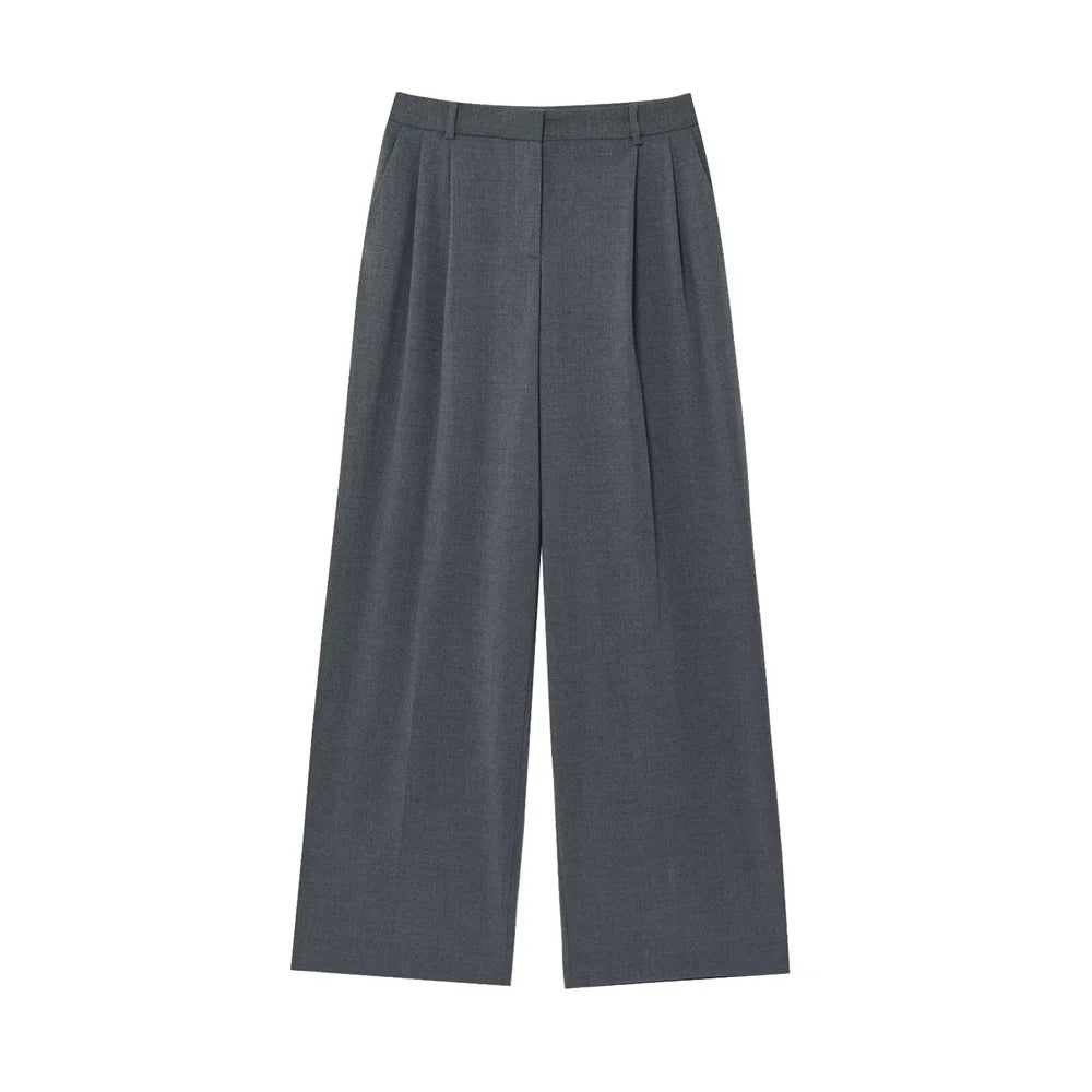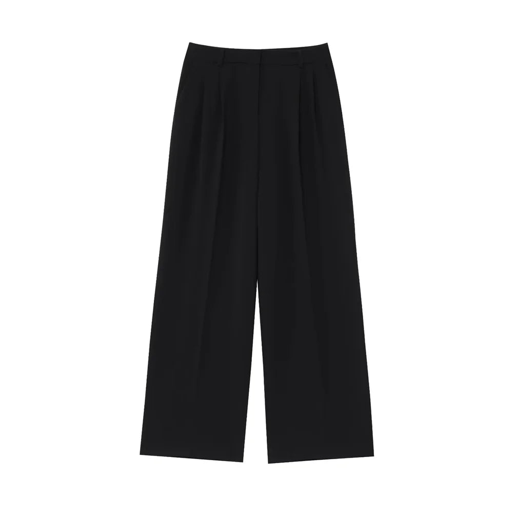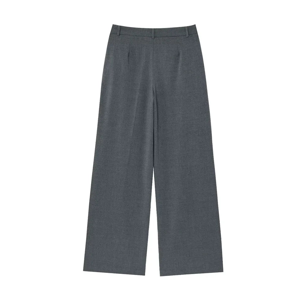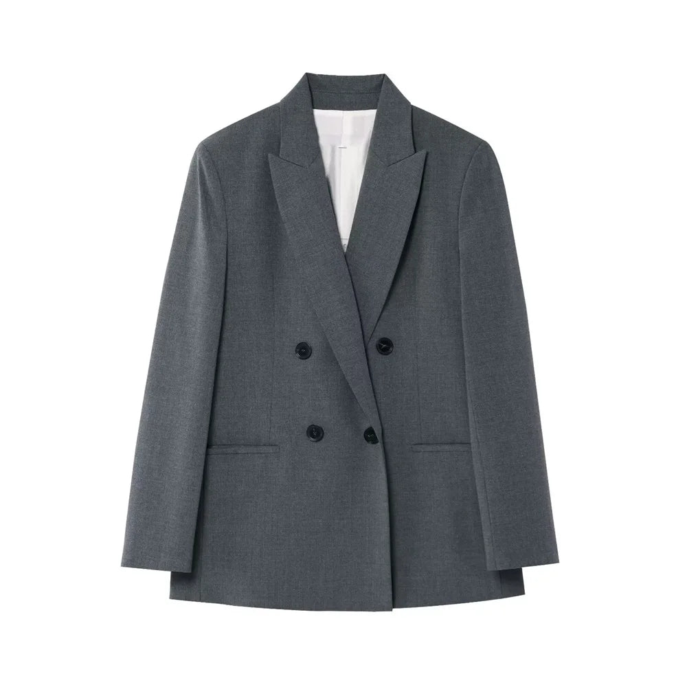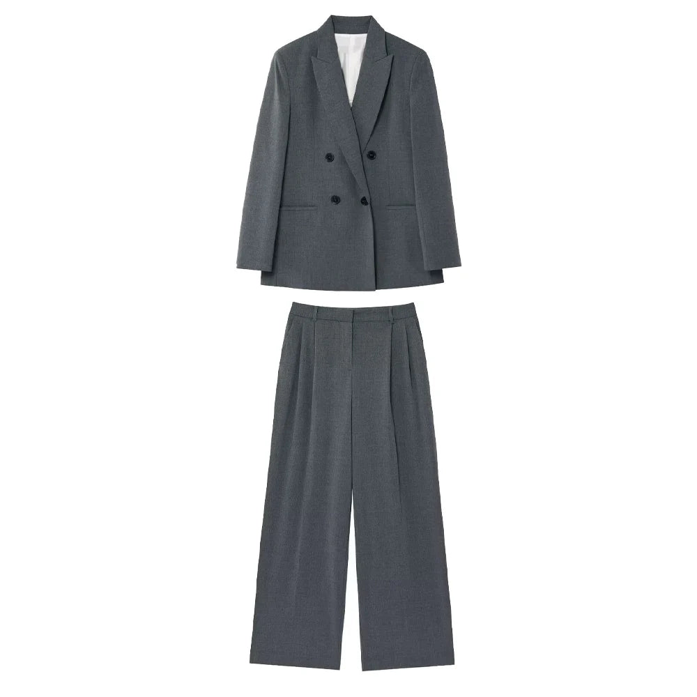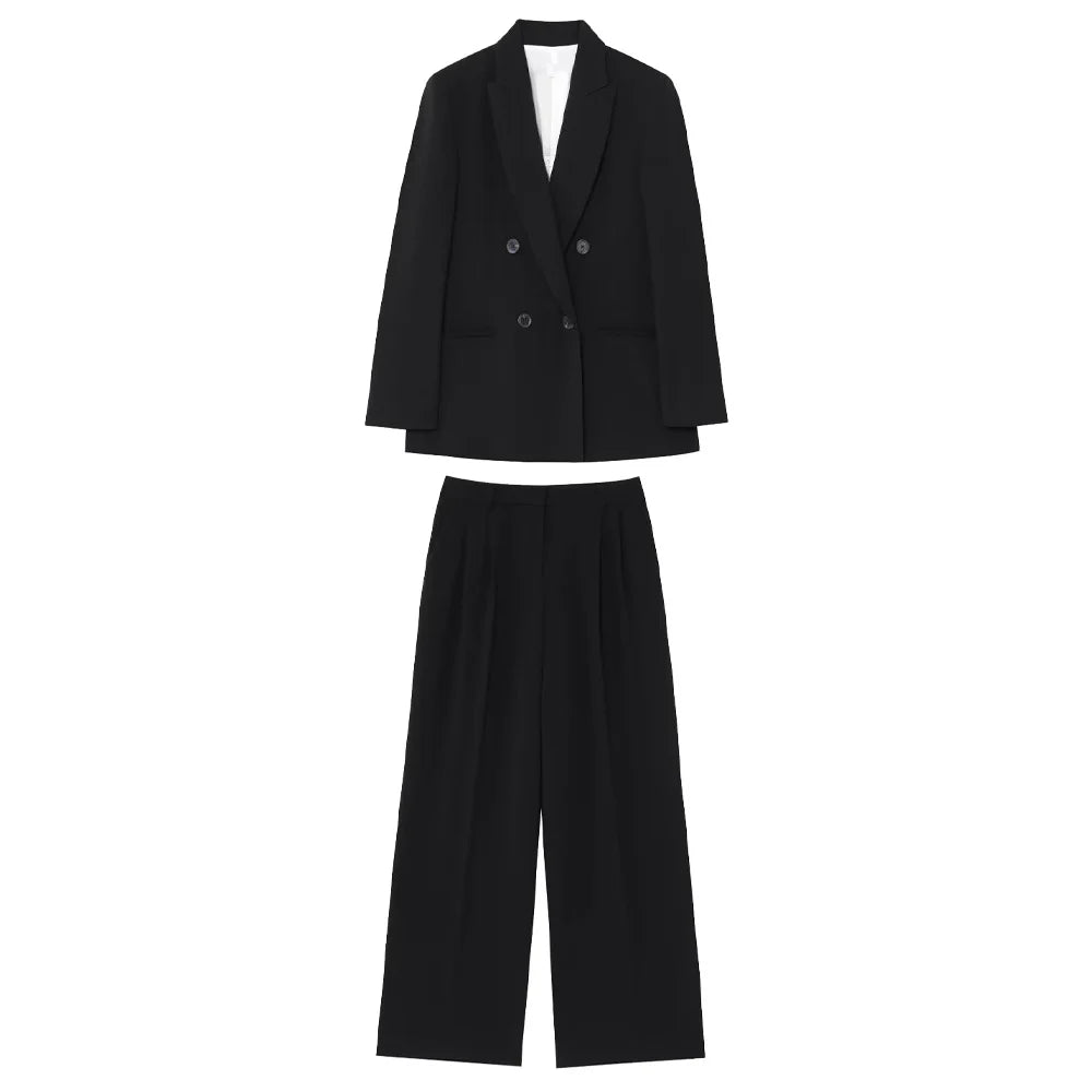 Jacky a refined two-piece set featuring a double-breasted jacket with structured shoulder pads and long sleeves, paired with high-waisted trousers. Designed for office wear, formal wear this polished ensemble delivers timeless sophistication and versatile styling.