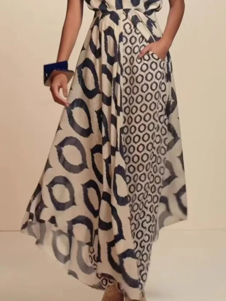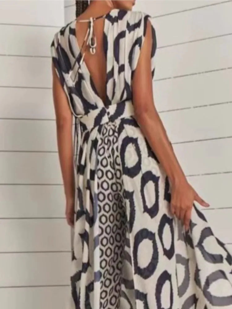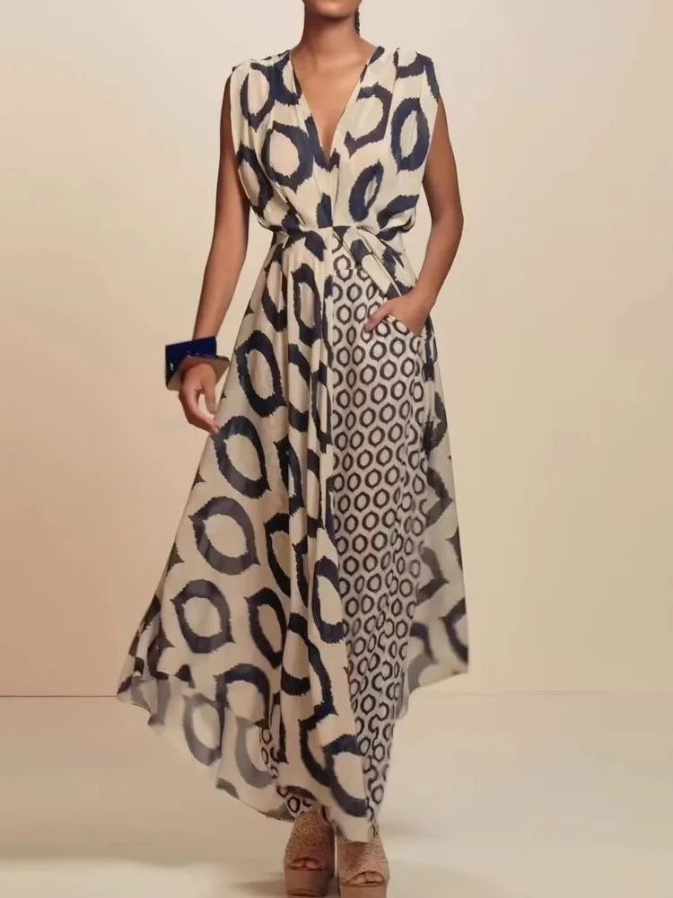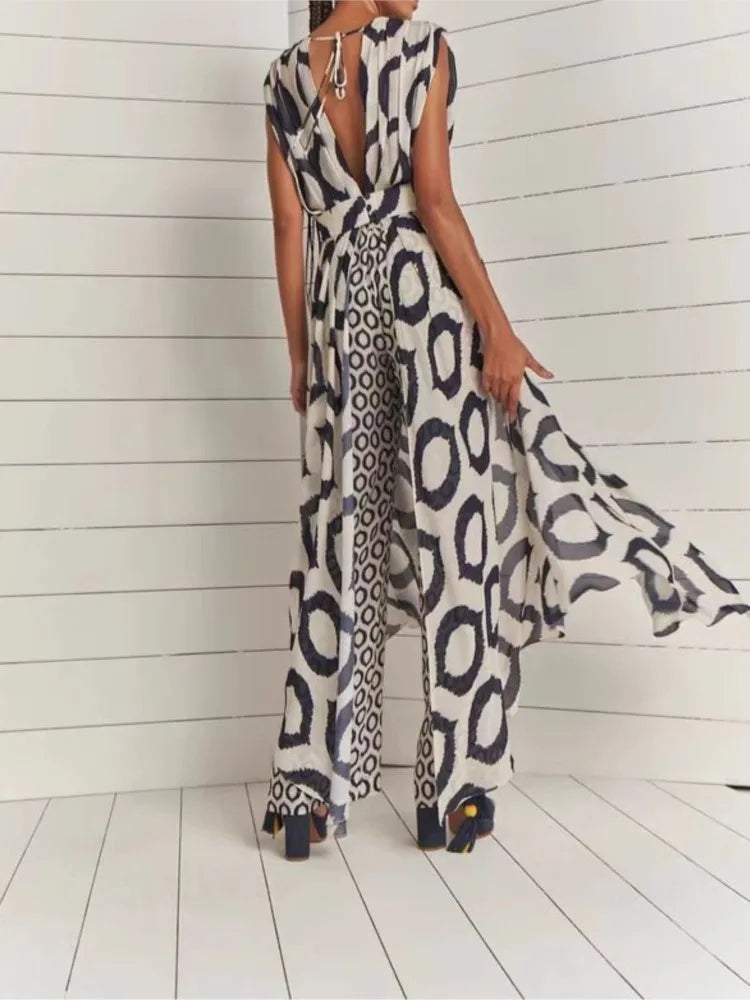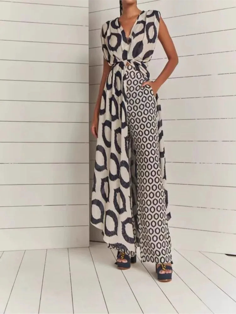 The Kayla set features a sleeveless V-neck lace-up top paired with printed pants, crafted for lightweight comfort and style during spring and summer. This two-piece ensemble offers an elegant yet casual look with a long top silhouette that flatters the figure, making it ideal for versatile daytime or evening occasions.