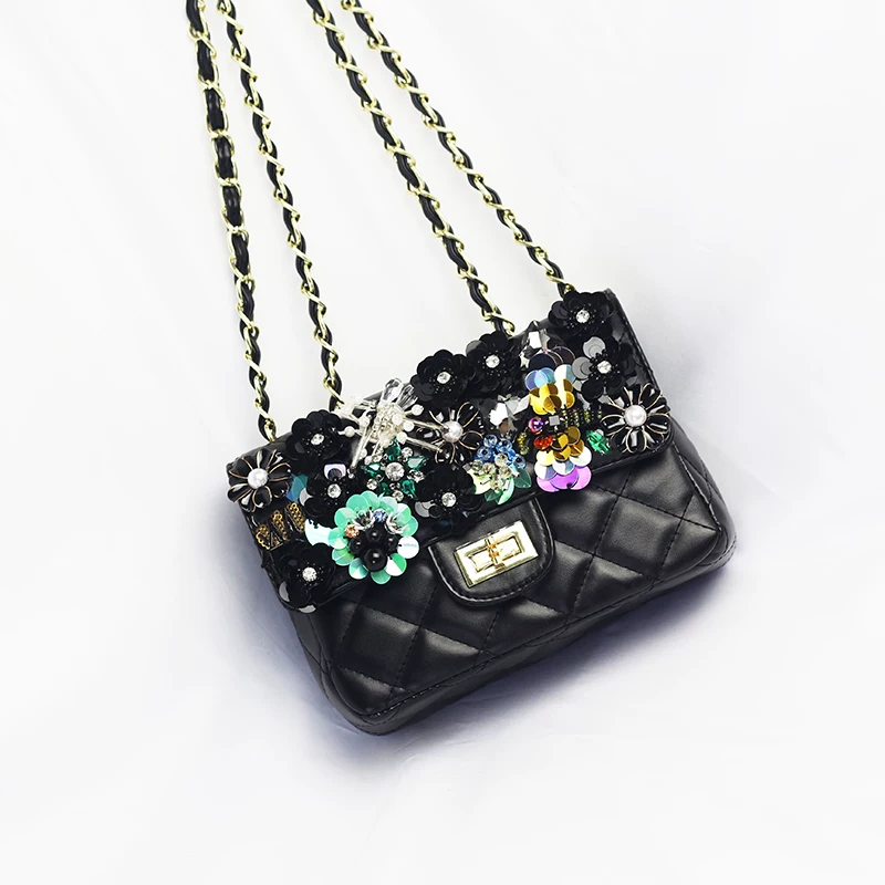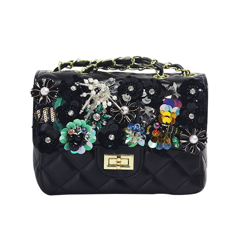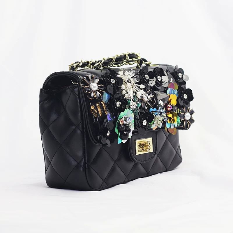 Add a pop of glam to your look with this stunning Leila Black Quilted Embellished Shoulder Bag! Featuring a classic quilted design, this bag stands out with its playful mix of colorful sequins, beads, and floral embellishments across the top. The gold and black chain strap adds a touch of elegance, while the secure turn-lock closure keeps your essentials safe. Perfect for parties, nights out, or whenever you want to make a statement.
