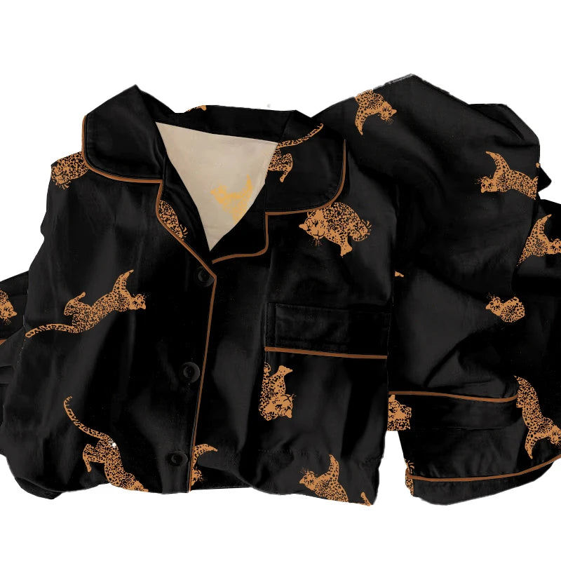 These black temperament pajamas for women blend style and comfort with a chic leopard print design. Perfectly suited for spring and fall, the long-sleeved top and matching pants offer versatility to be worn both as cozy homewear or confidently outside. Crafted to provide a flattering fit, this set balances relaxed comfort with fashionable appeal, making it an ideal choice for casual outings or lounging at home.