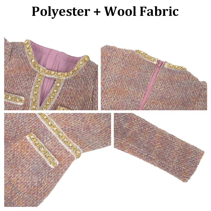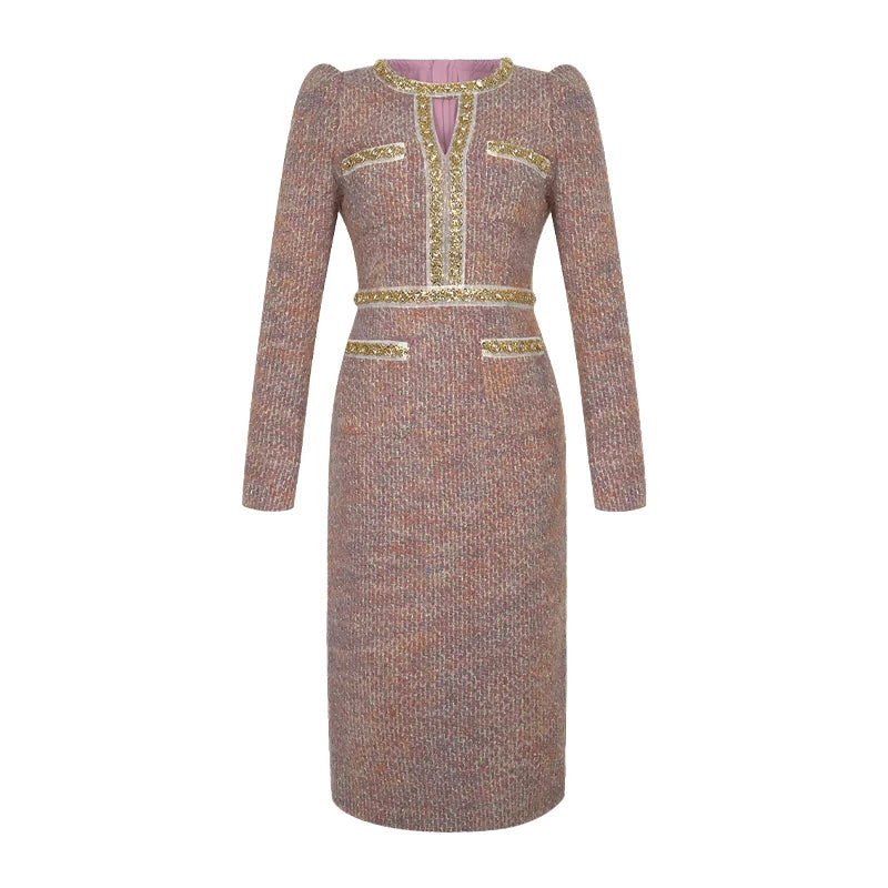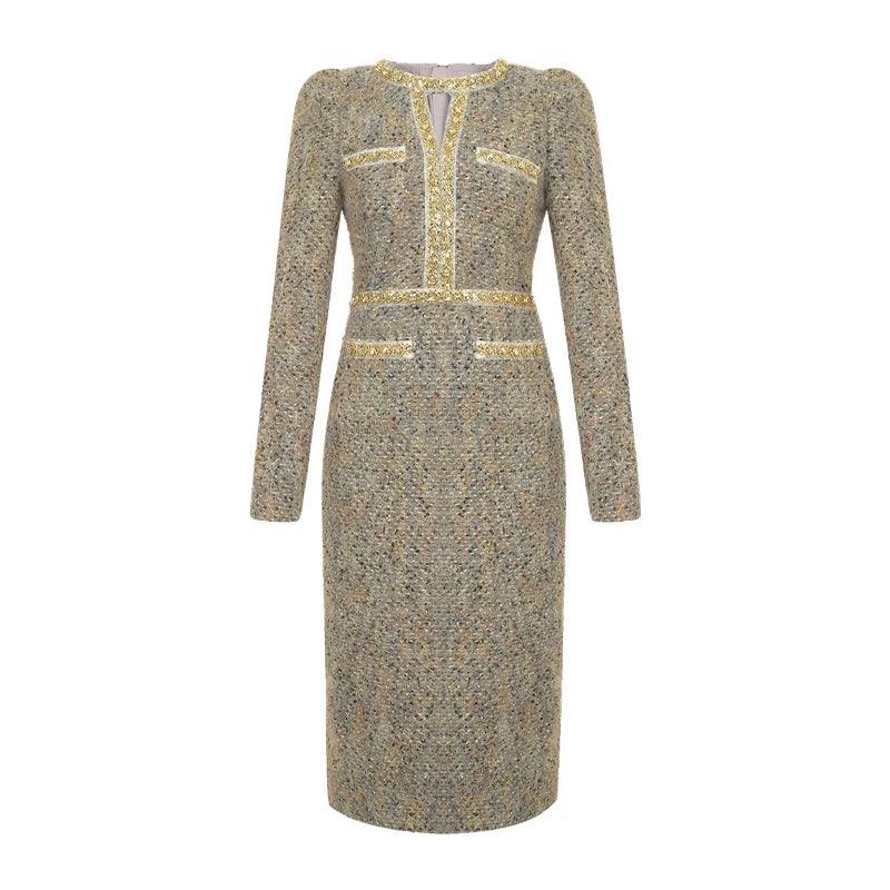 The Lexy  designer dress exemplifies sophisticated design with its crew neck and straight silhouette, crafted from premium plaid tweed fabric. This elegant formal dress offers a timeless look ideal for professional and upscale occasions. Its tailored fit ensures a flattering shape while providing comfort and durability, making it a versatile addition to any refined wardrobe.