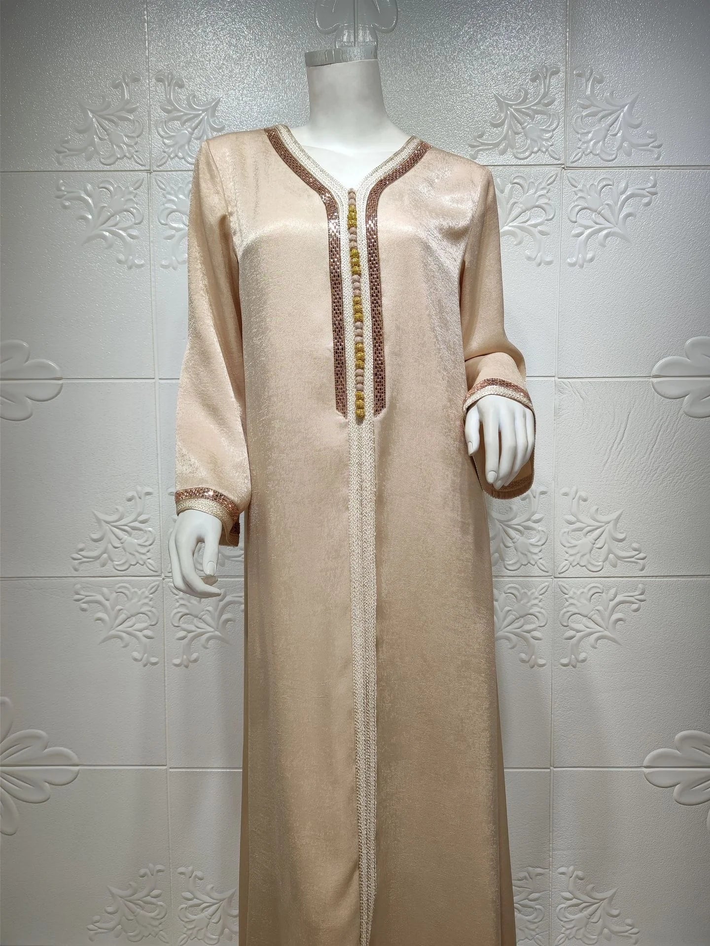 The Lilian kaftan embodies luxury with its rich gold hue and exquisite diamond embellishments. Inspired by Arabic tradition, this elegant piece combines a radiant shine with expert craftsmanship, offering a sophisticated look for formal events. Its flowing design ensures both comfort and a graceful silhouette, making it an ideal choice for those seeking timeless elegance and refined style.