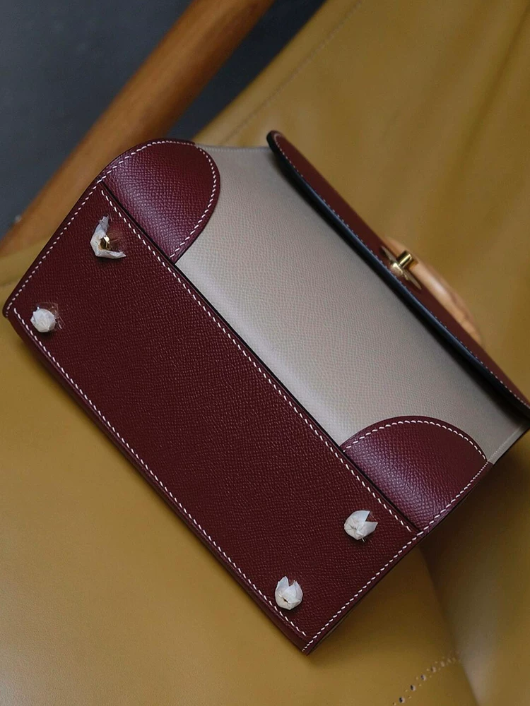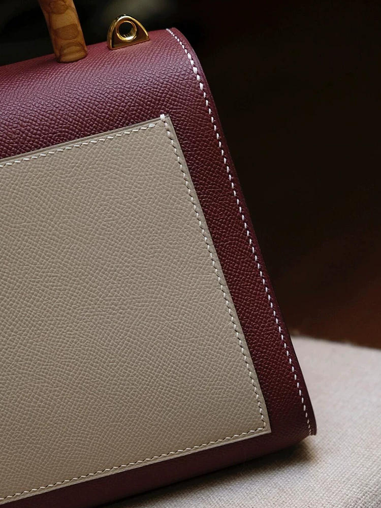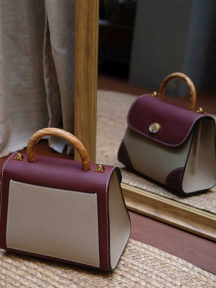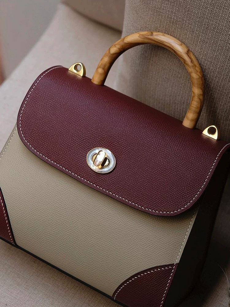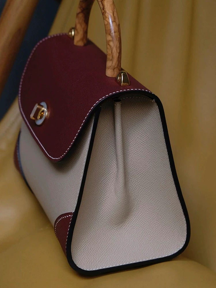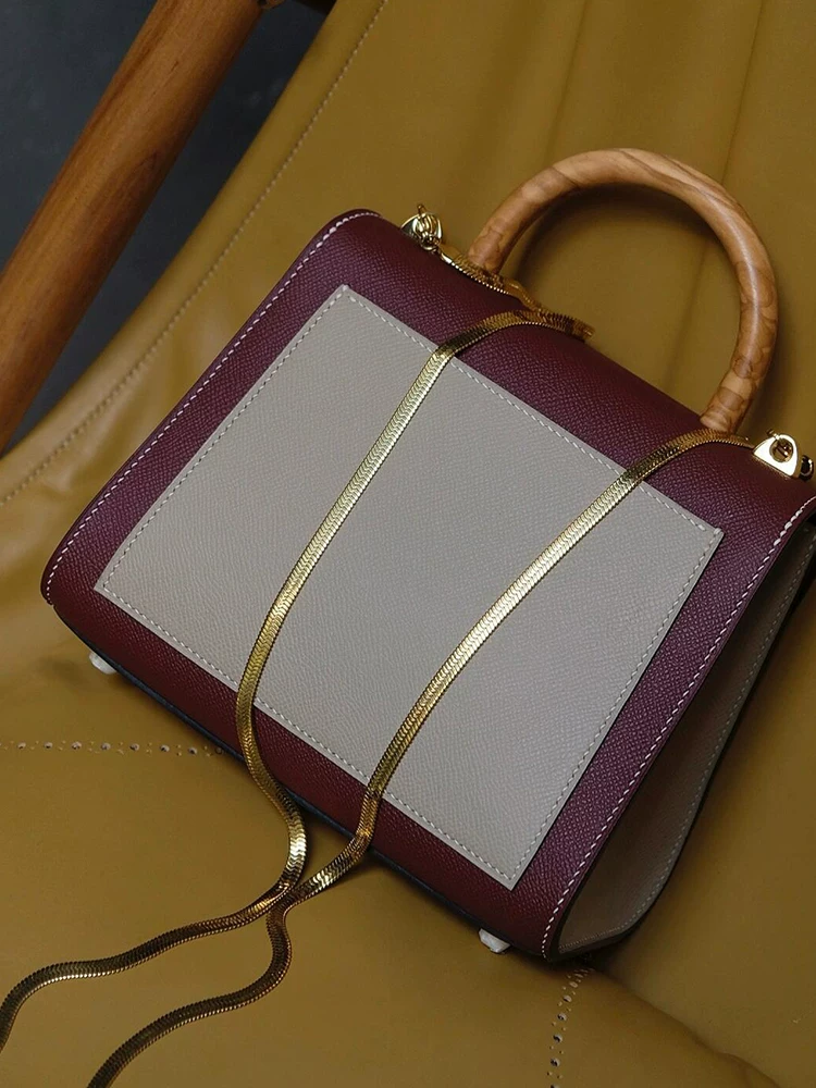 This elegant color-block handbag features a beige and burgundy design, a wood-style handle, and gold hardware. It comes with a long gold strap, so you can wear it as a crossbody or shoulder bag. Perfect for adding a touch of sophistication to any outfit!