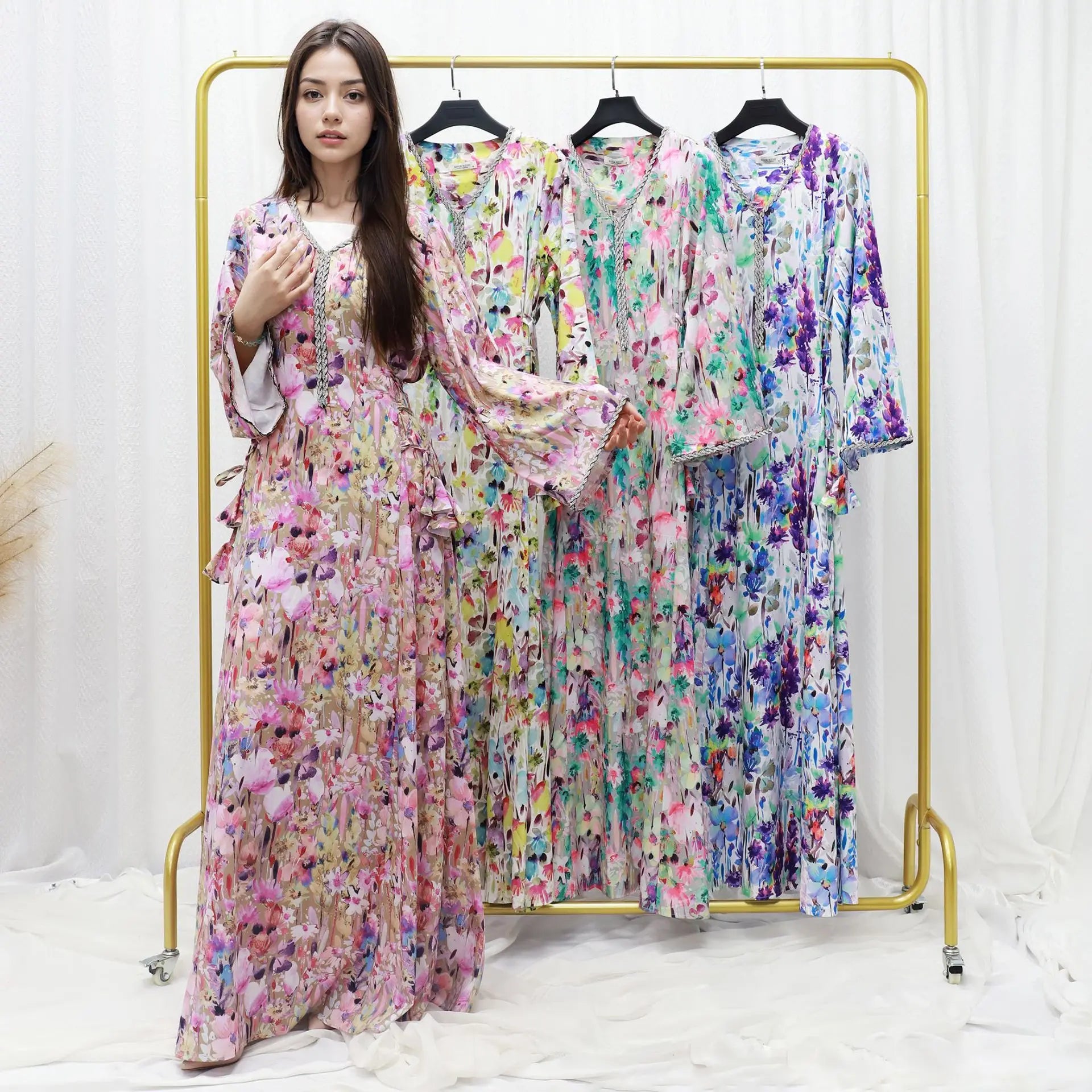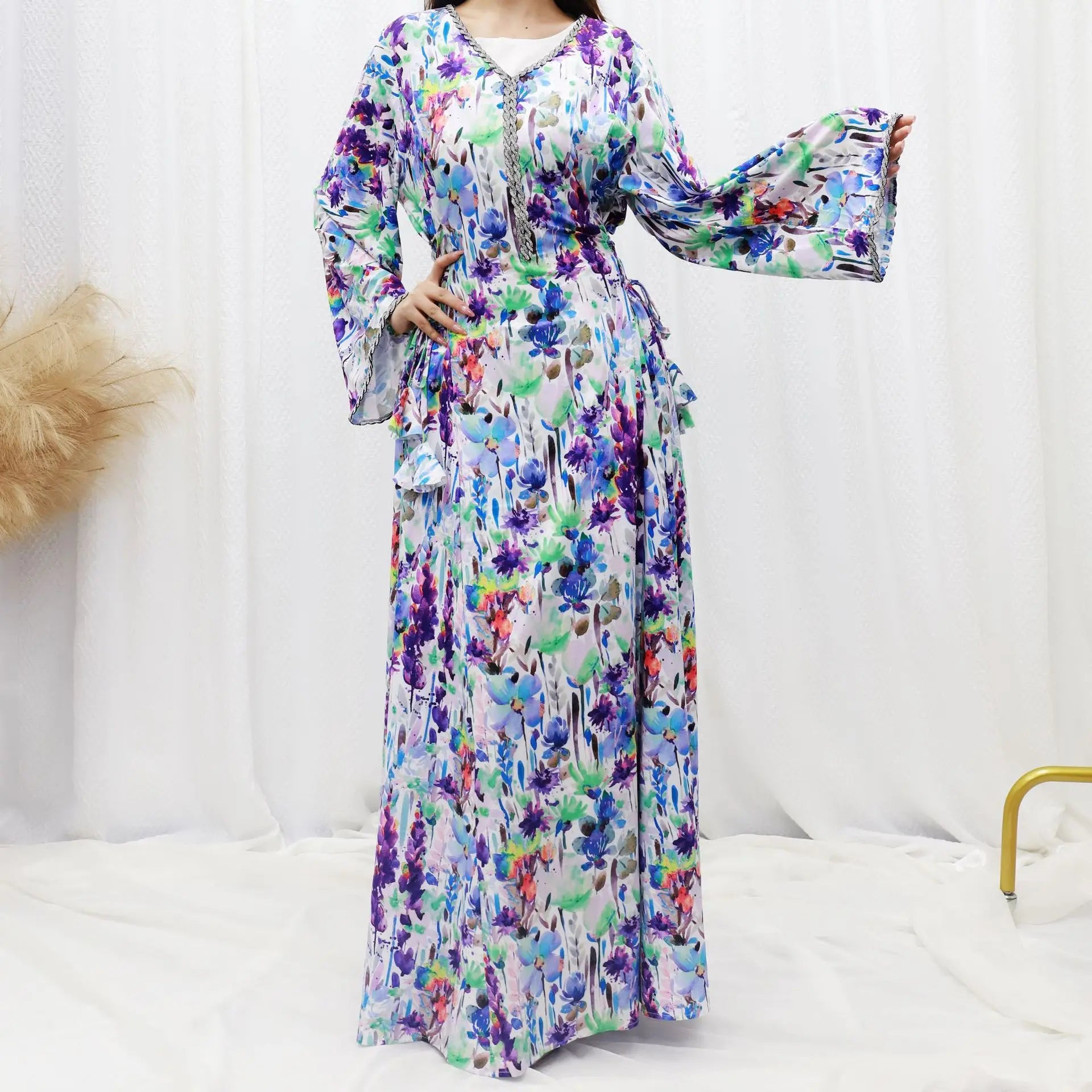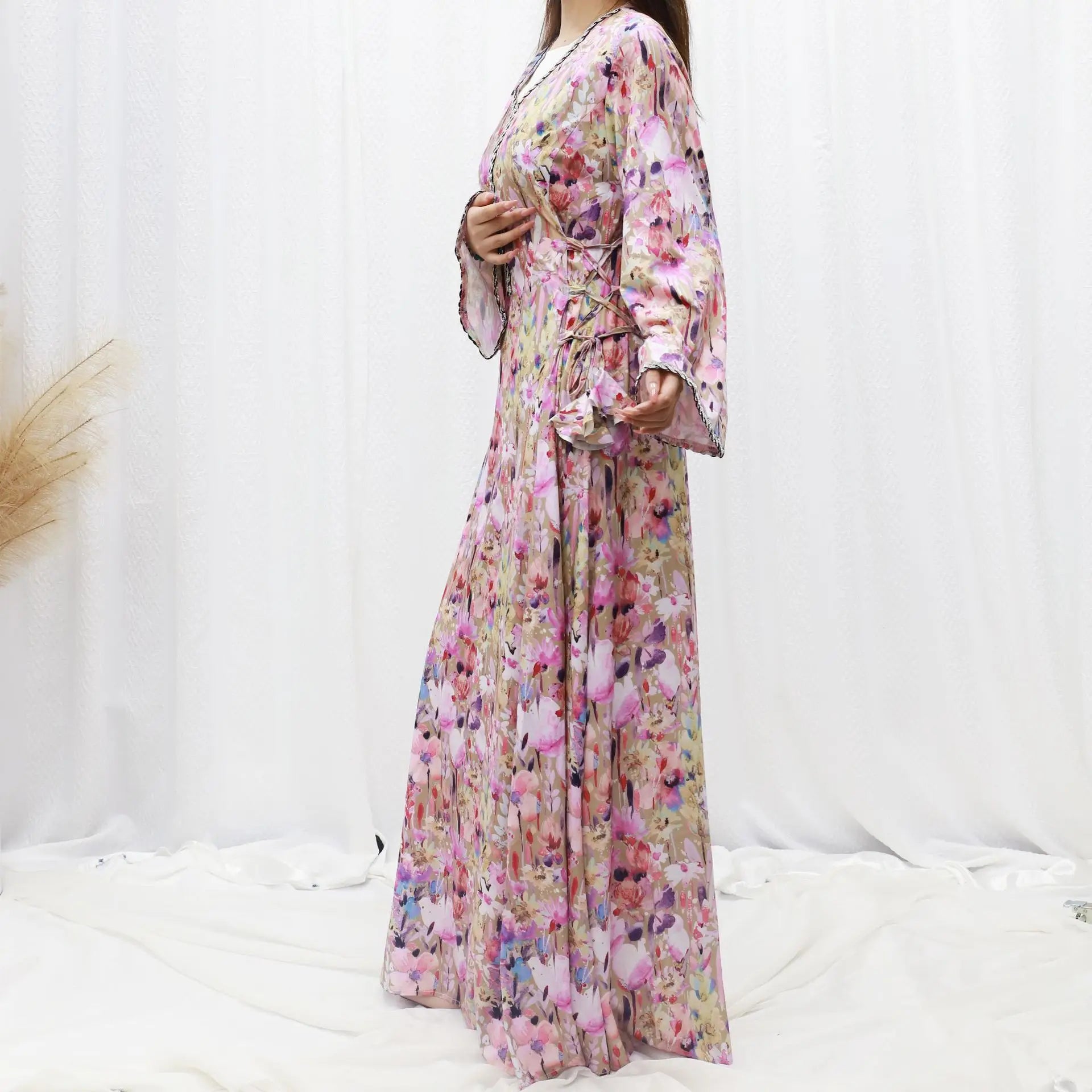 Elevate your summer wardrobe with the Rahma dress, featuring an elegant long silhouette and a beautifully printed skirt. Designed with a modest V-neck and adorned with subtle diamond flower accents, this dress combines sophistication with cultural grace. Perfect for warm weather, its lightweight fabric ensures comfort while maintaining a refined look suitable for various occasions.