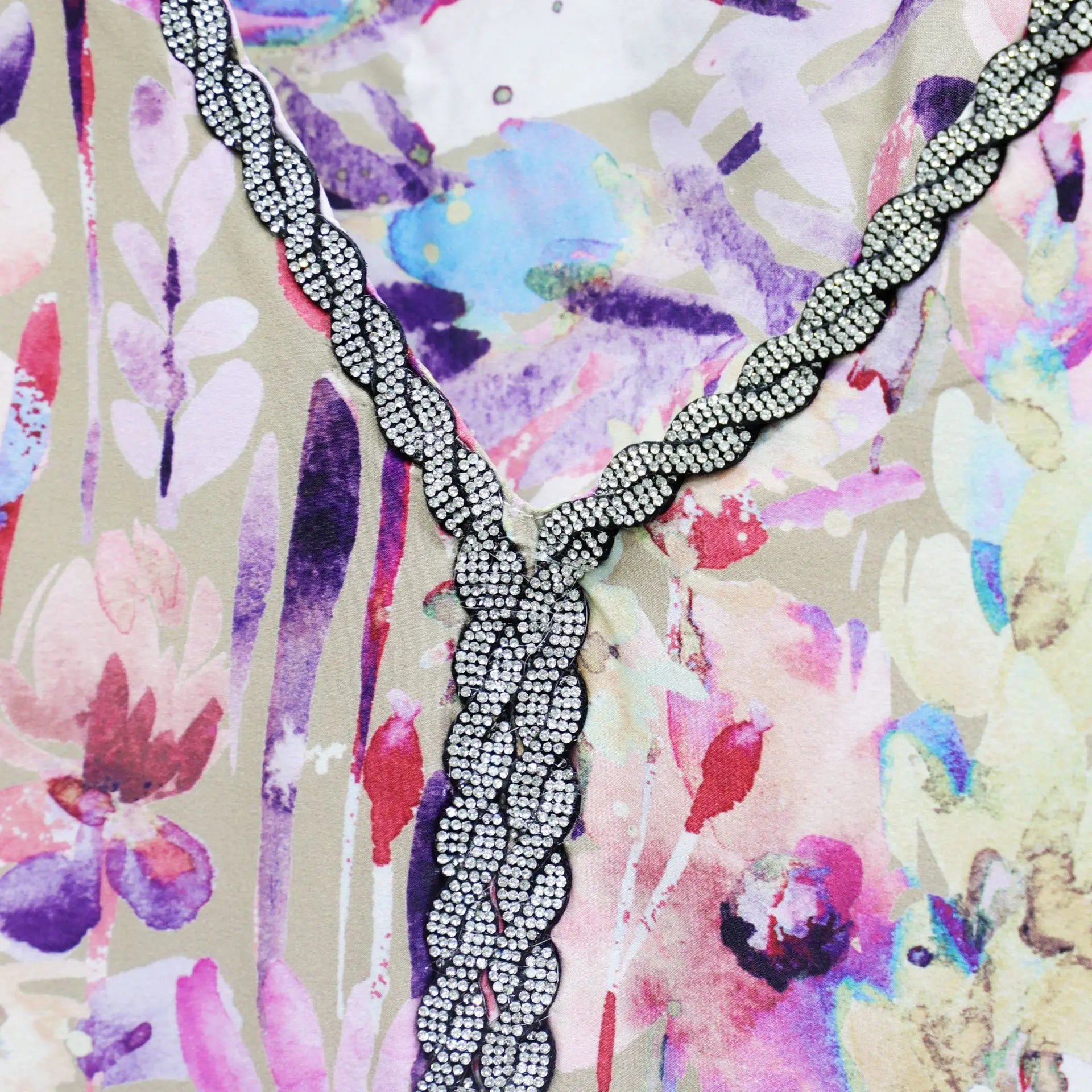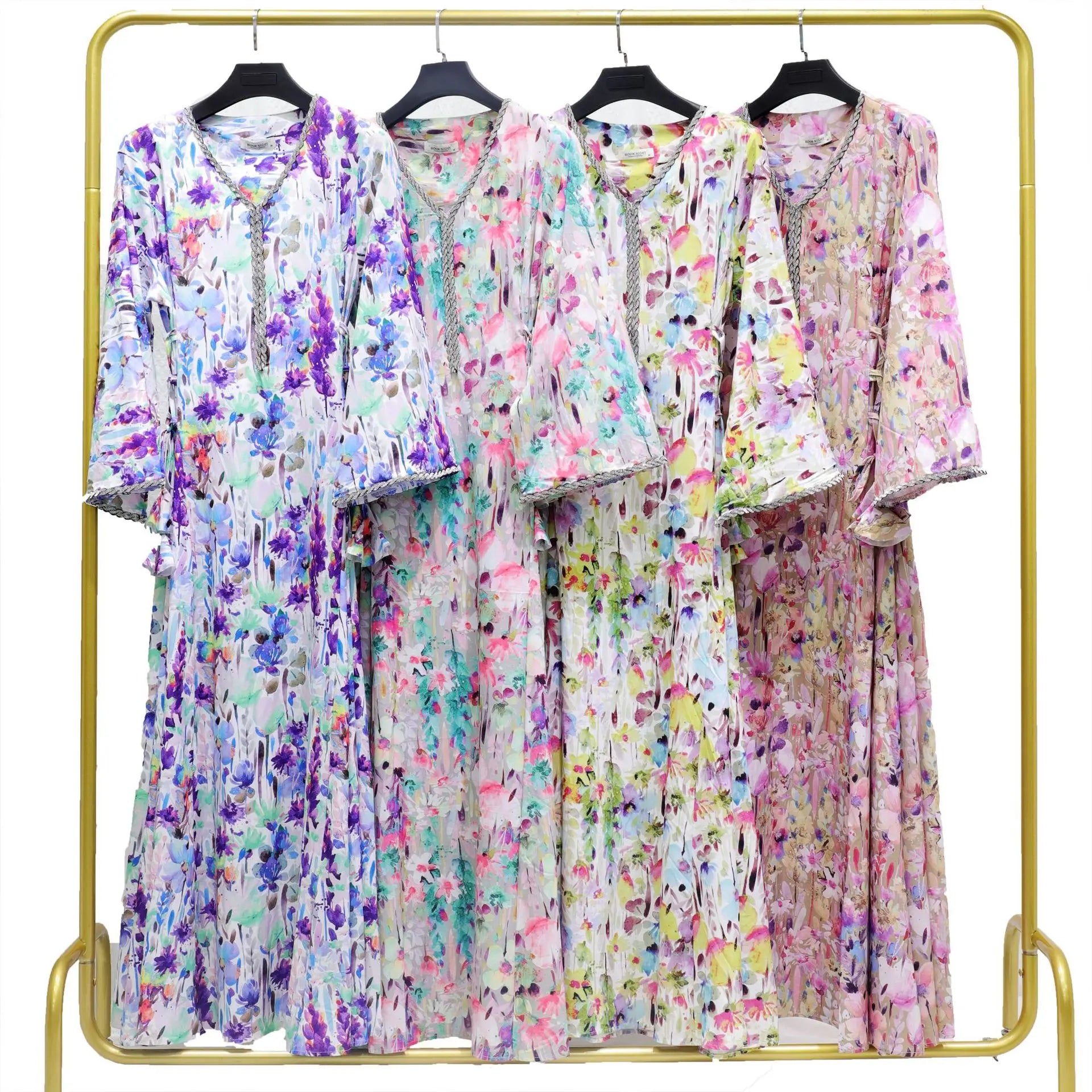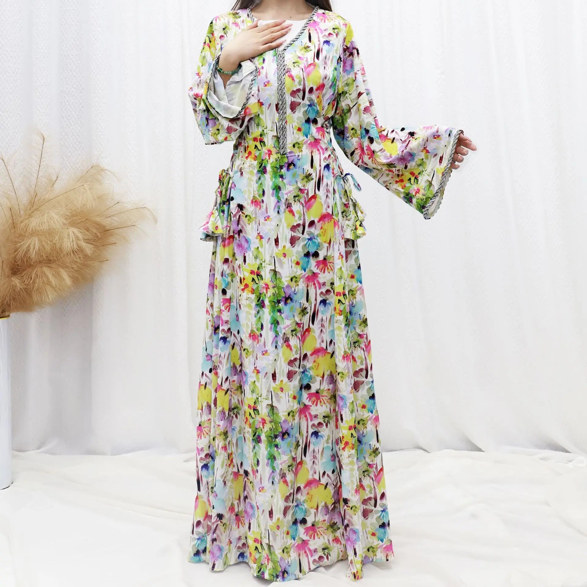Elevate your summer wardrobe with the Rahma dress, featuring an elegant long silhouette and a beautifully printed skirt. Designed with a modest V-neck and adorned with subtle diamond flower accents, this dress combines sophistication with cultural grace. Perfect for warm weather, its lightweight fabric ensures comfort while maintaining a refined look suitable for various occasions.