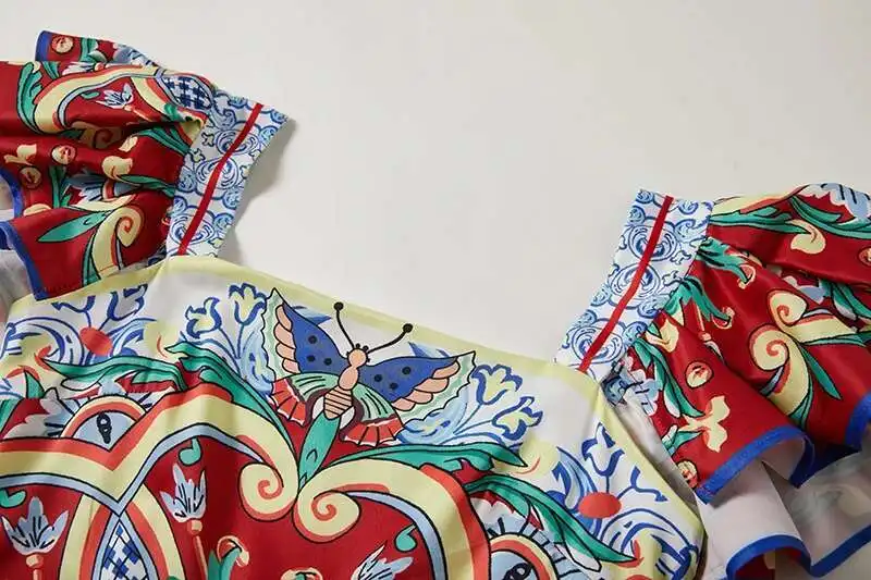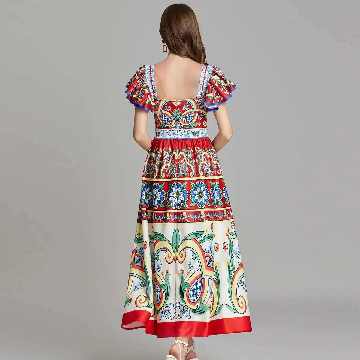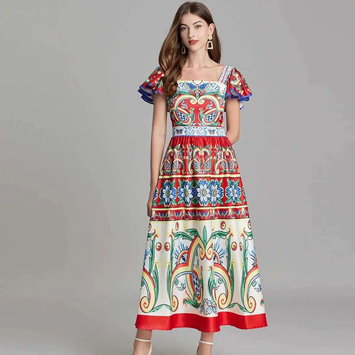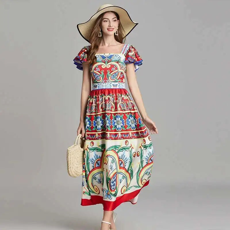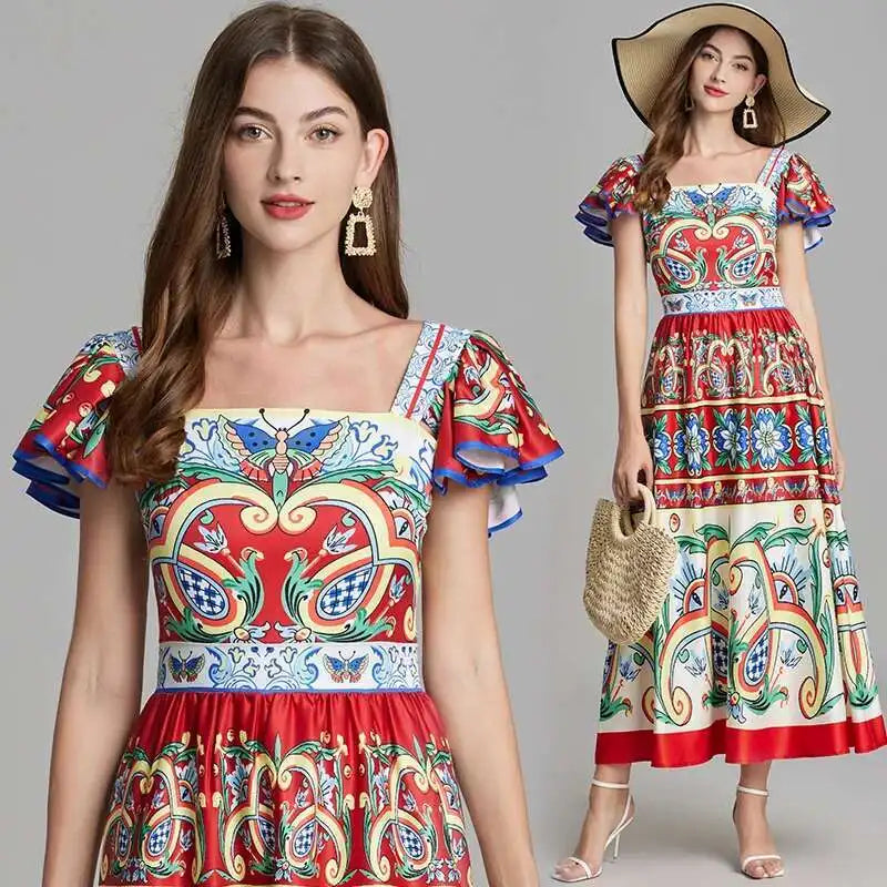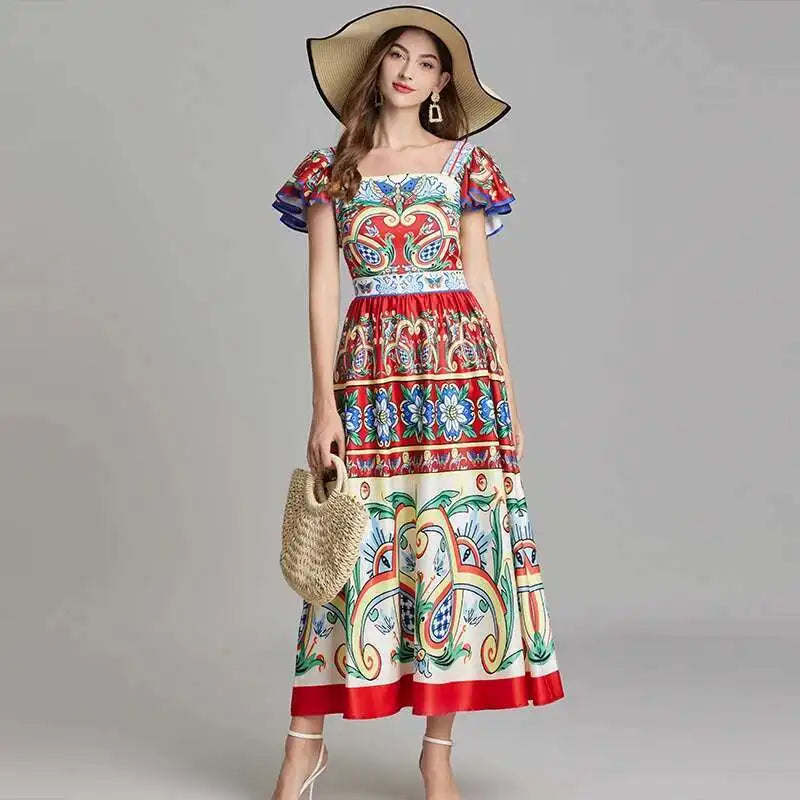 The Reena dress is a refined summer wardrobe staple, featuring a delicate floral print and an A-line silhouette that enhances natural elegance. With short sleeves and a distinctive national trench design, it merges bohemian charm with sophisticated style. Crafted from lightweight, breathable fabric, this long dress is perfect for beach outings and holiday occasions, providing comfort without compromising on grace.