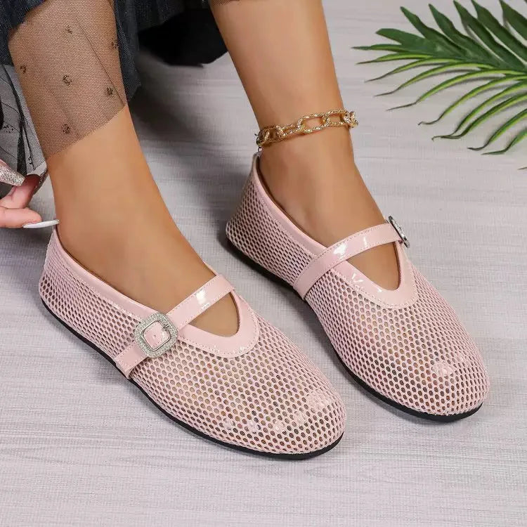 Baotou Women's 2025 summer sandals feature lightweight fish mesh and a hollow design for breathability. These plus-size, flat-bottom Mary Jane shoes offer a secure fit with lace-up and buckle closures, combining comfort with style.