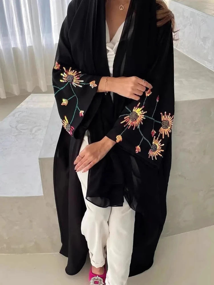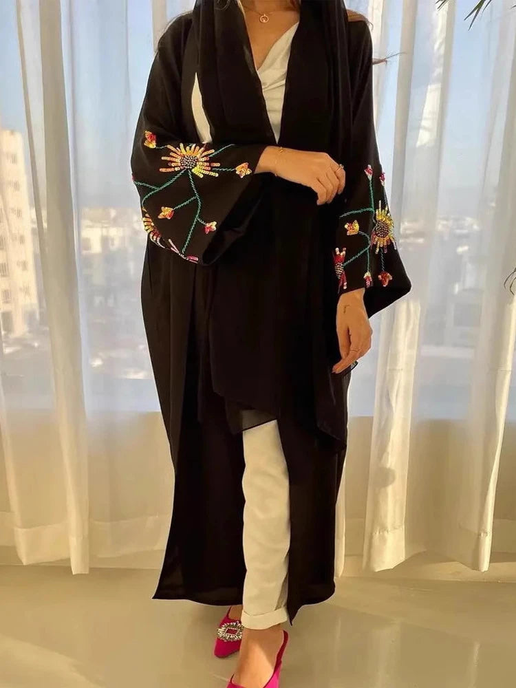 The Salahma abaya features a classic black fabric enhanced with delicate floral embroidery on the hand sleeves, combining traditional elegance with subtle decorative detail. This design offers a refined look suitable for various occasions, emphasizing craftsmanship and understated sophistication.