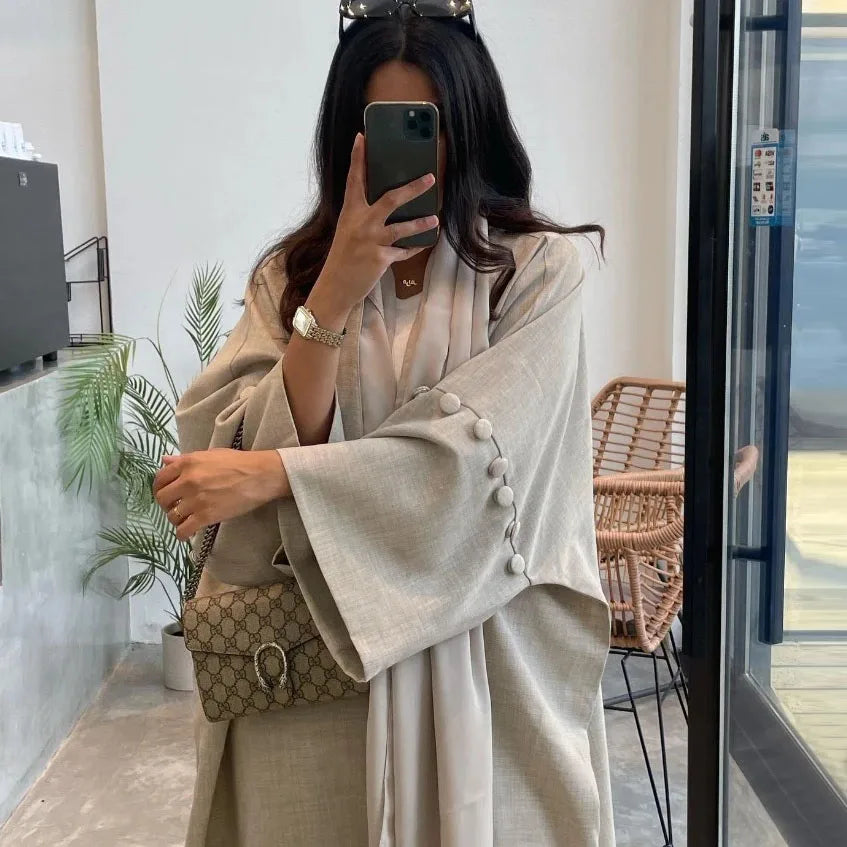 Introducing Shamira, a stylish and modest option for your next EID celebration. Crafted from a blend of polyester and linen, this Islamic abaya features traditional Turkish design with a modern twist. The kimono style, button-up dress offers both comfort and elegance for women of all ages. Perfect for your next EID gathering.