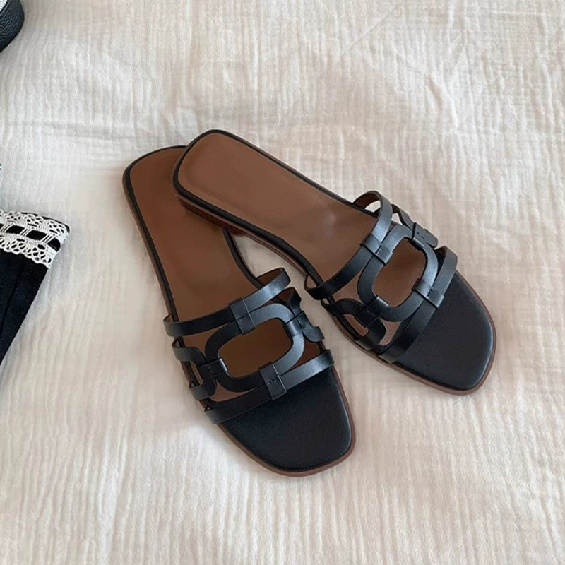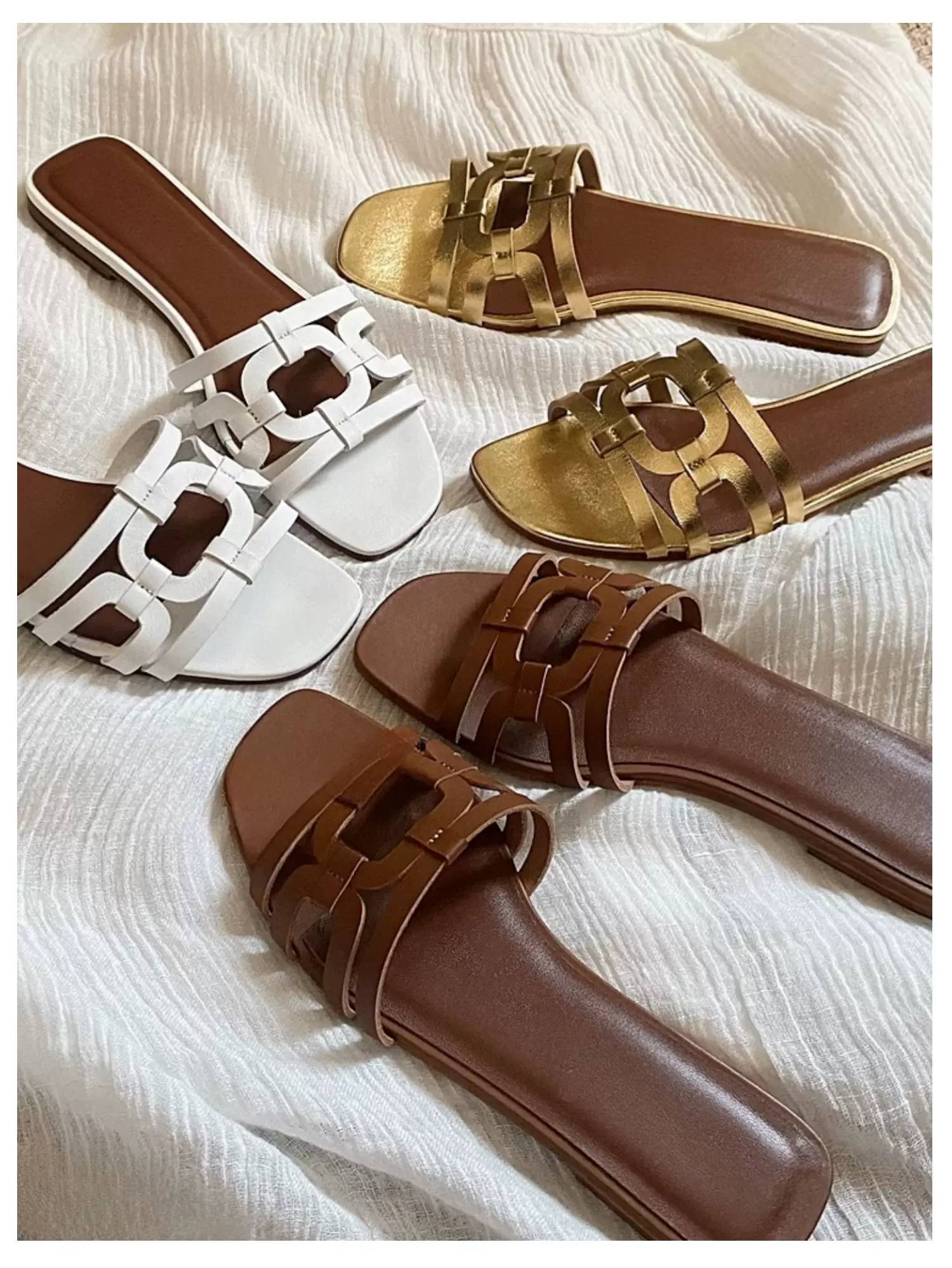 Step into effortless style with our chic cut-out slide sandals, available in classic white, rich brown, sleek black, and eye-catching gold. Featuring a trendy geometric strap design and a comfortable flat sole, these sandals are perfect for everyday wear or dressing up your summer look. Slip them on for a day at the beach, brunch with friends, or a casual stroll. Versatile, comfy, and easy to pair with any outfit—these slides are a must-have for your wardrobe!